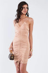 Dress Features: Solid nude, sleeveless, v-neck, center drawstring, fully body ruching, adjustable cami straps, bodycon, mini length, stretchy, unlined, sexy, clubwearModel is 5'9" and wearing size Small (Waist: 23.5", Bust: 32B, Hips: 36")Item Measurements: Length: 39" , Bust: 28"Item pre-packedTrue to Size