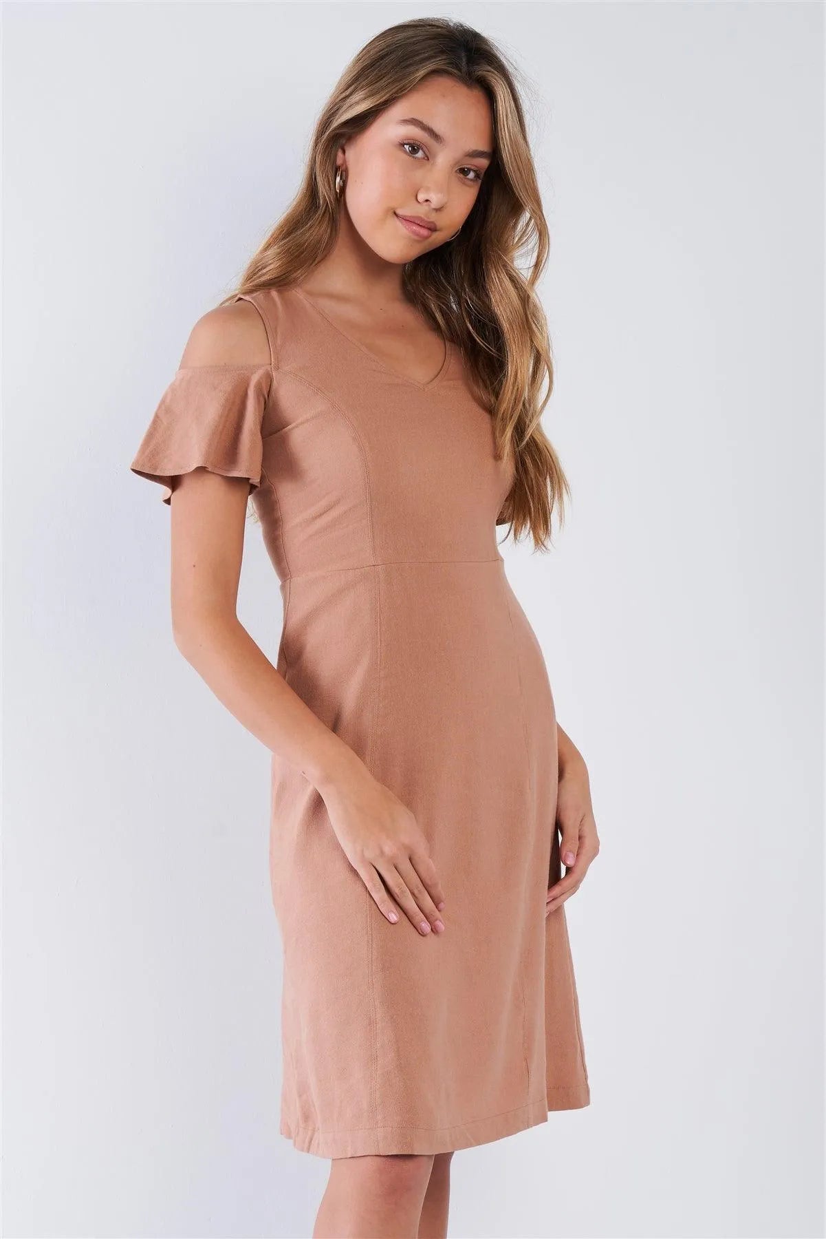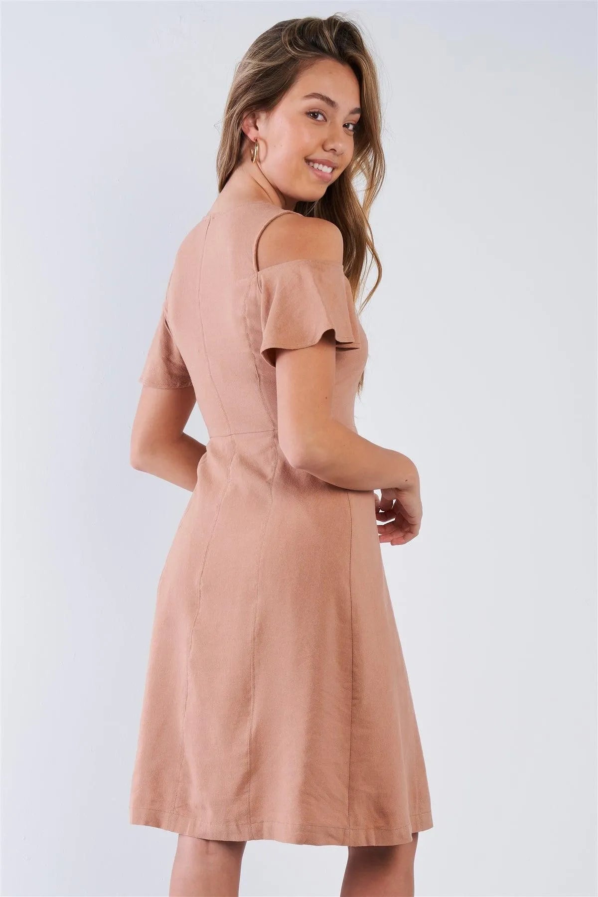 Nude V-neck Linen Cold Shoulder Sun Dress /1-2-2-1