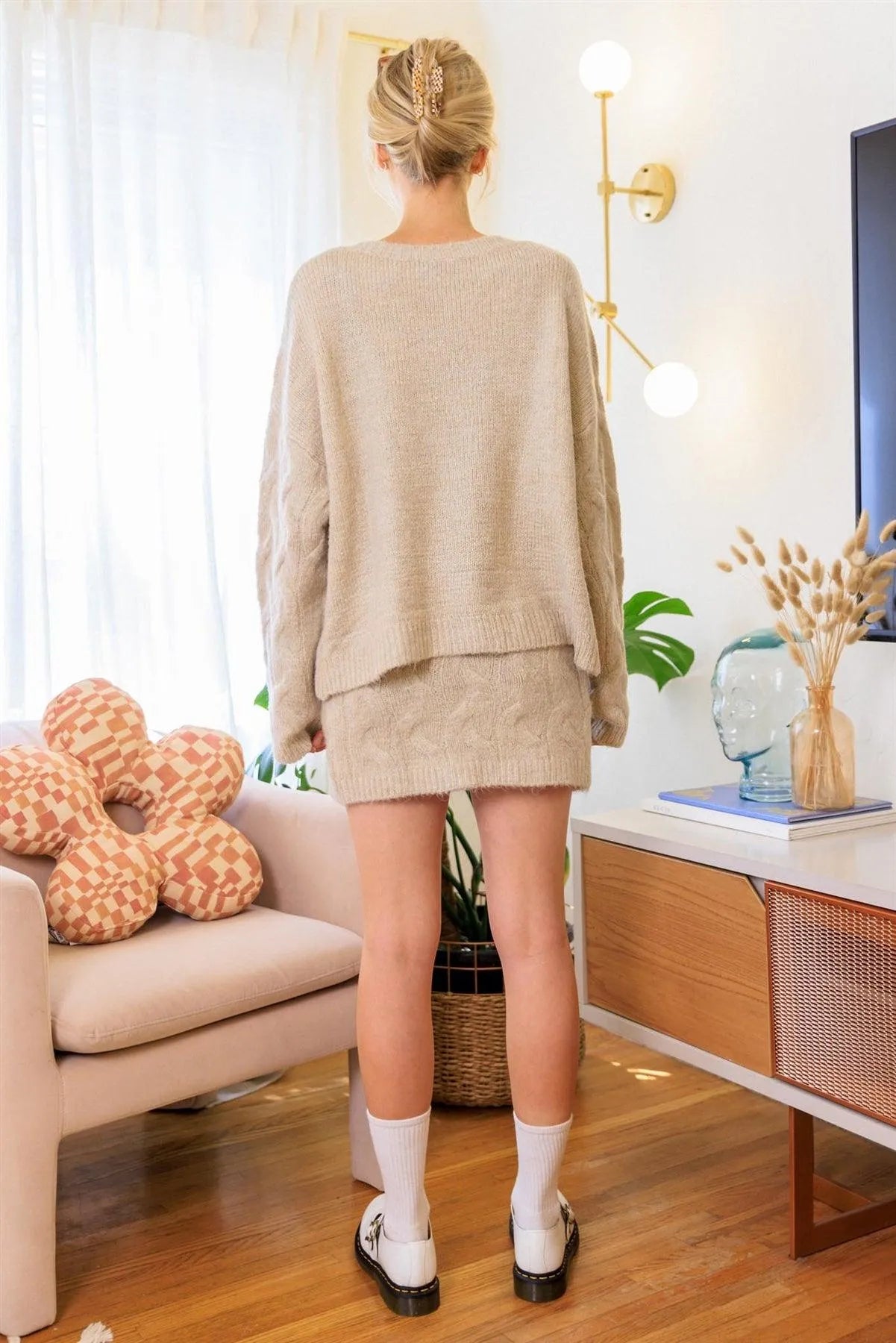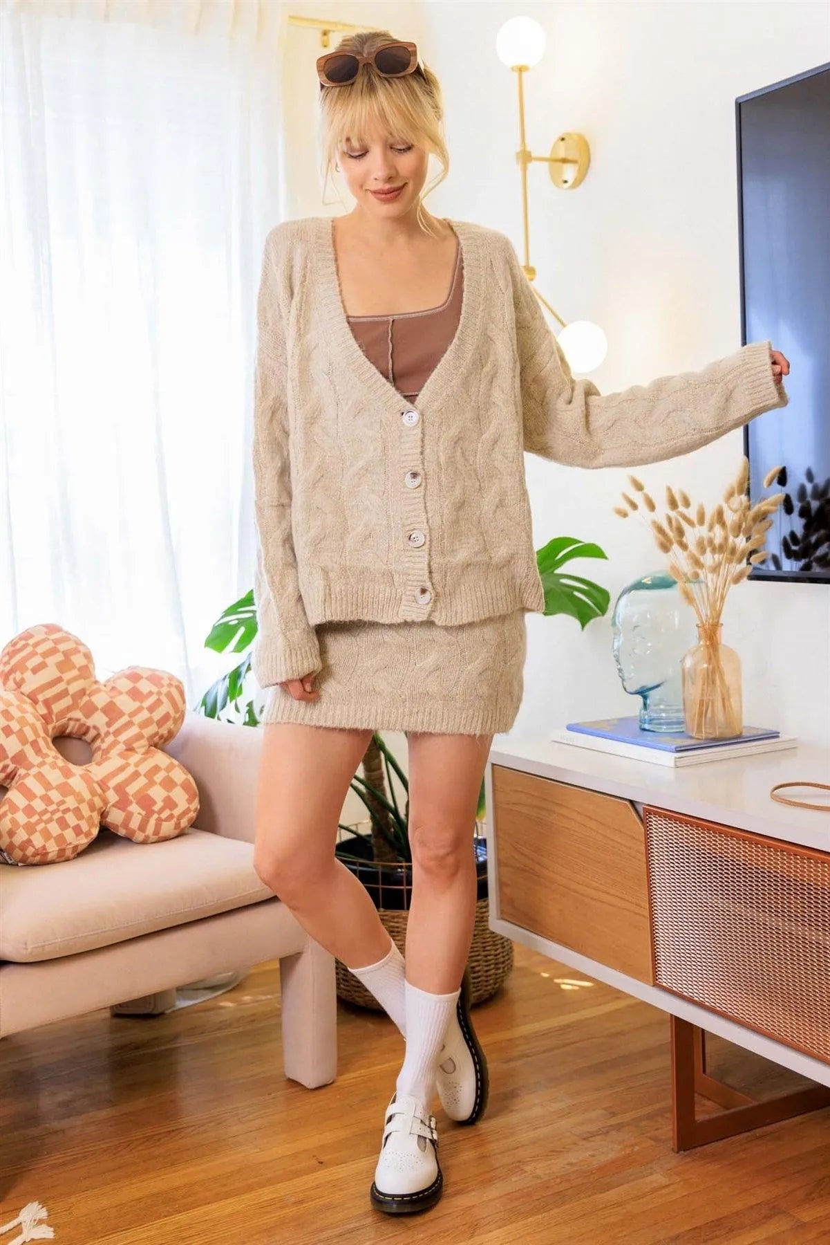 🖤 Item Features: Oatmeal, solid color, cable knit material, front button up closure, v-neckline, long sleeves, dropped shoulders, oversize fit cardigan, high waist skirt, elasticized waistband, mini length, unlined, stretchy, non-sheer, casual, warm, cozy, soft-to-touch, fall/winter collection