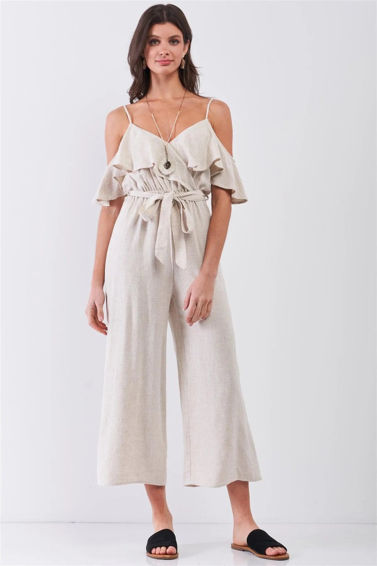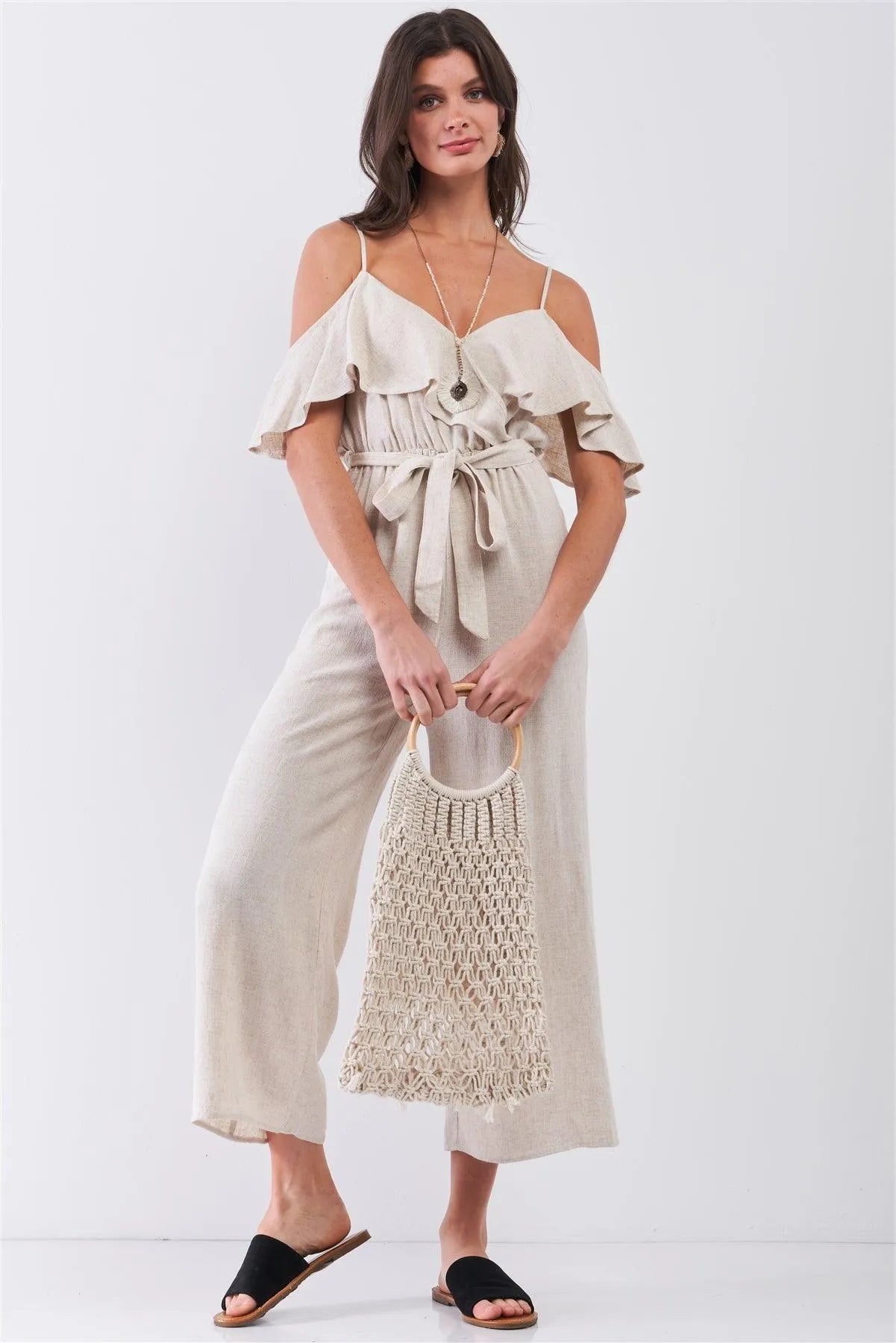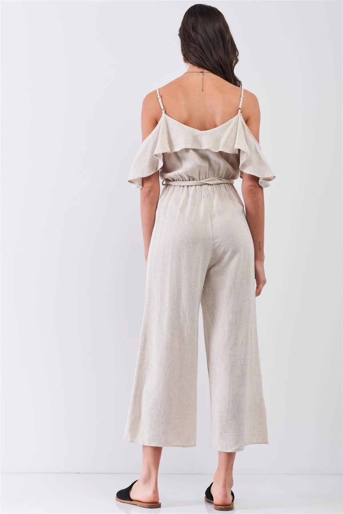 Oatmeal Natural Linen Off-The-Shoulder V-Neck Ruffle Hem Wide Leg Maxi Jumpsuit /3-2-1