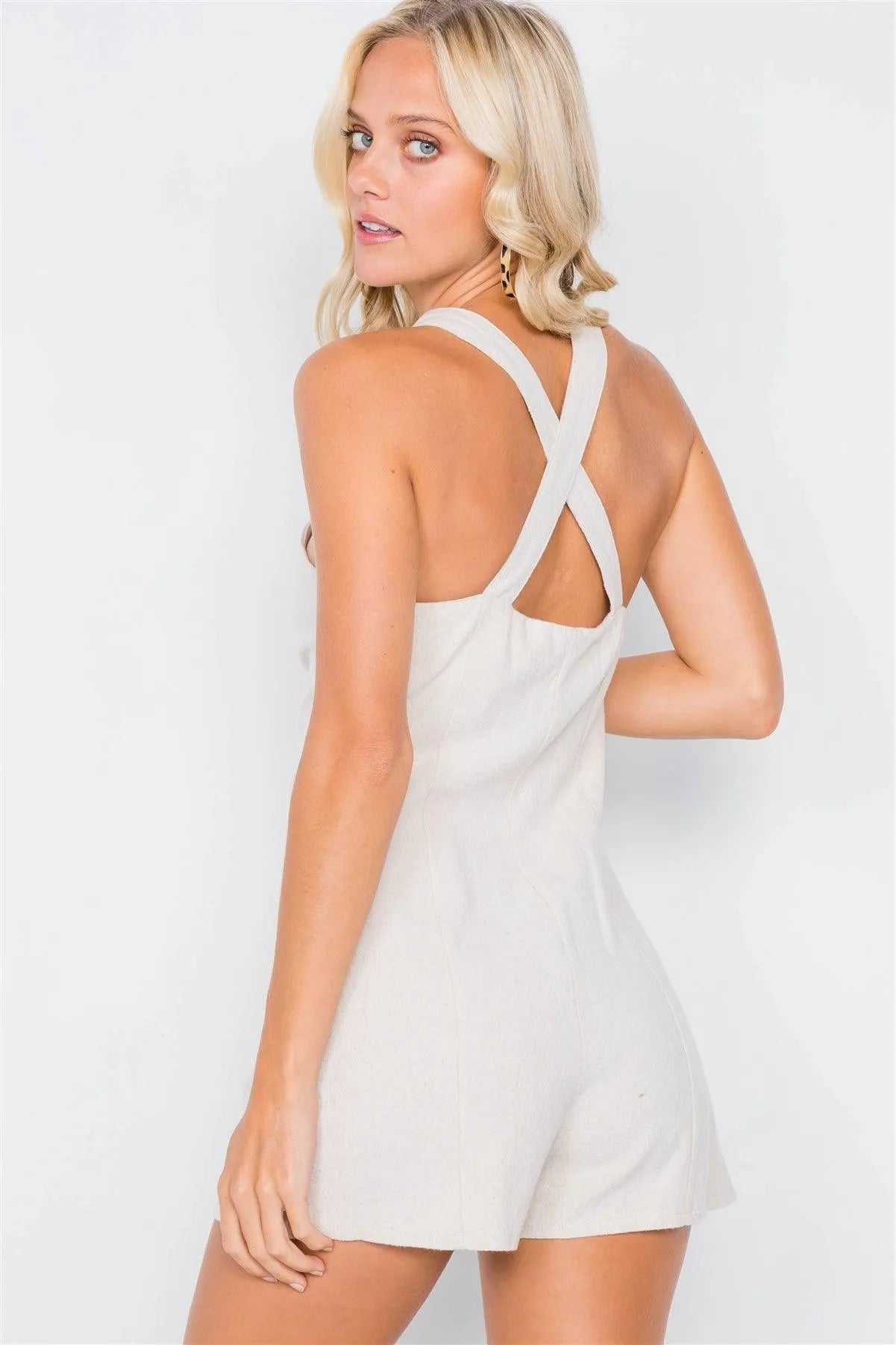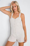 Linen Blend Button-Up Short Sleeve Belted Utility RomperVendor:HYFVE
