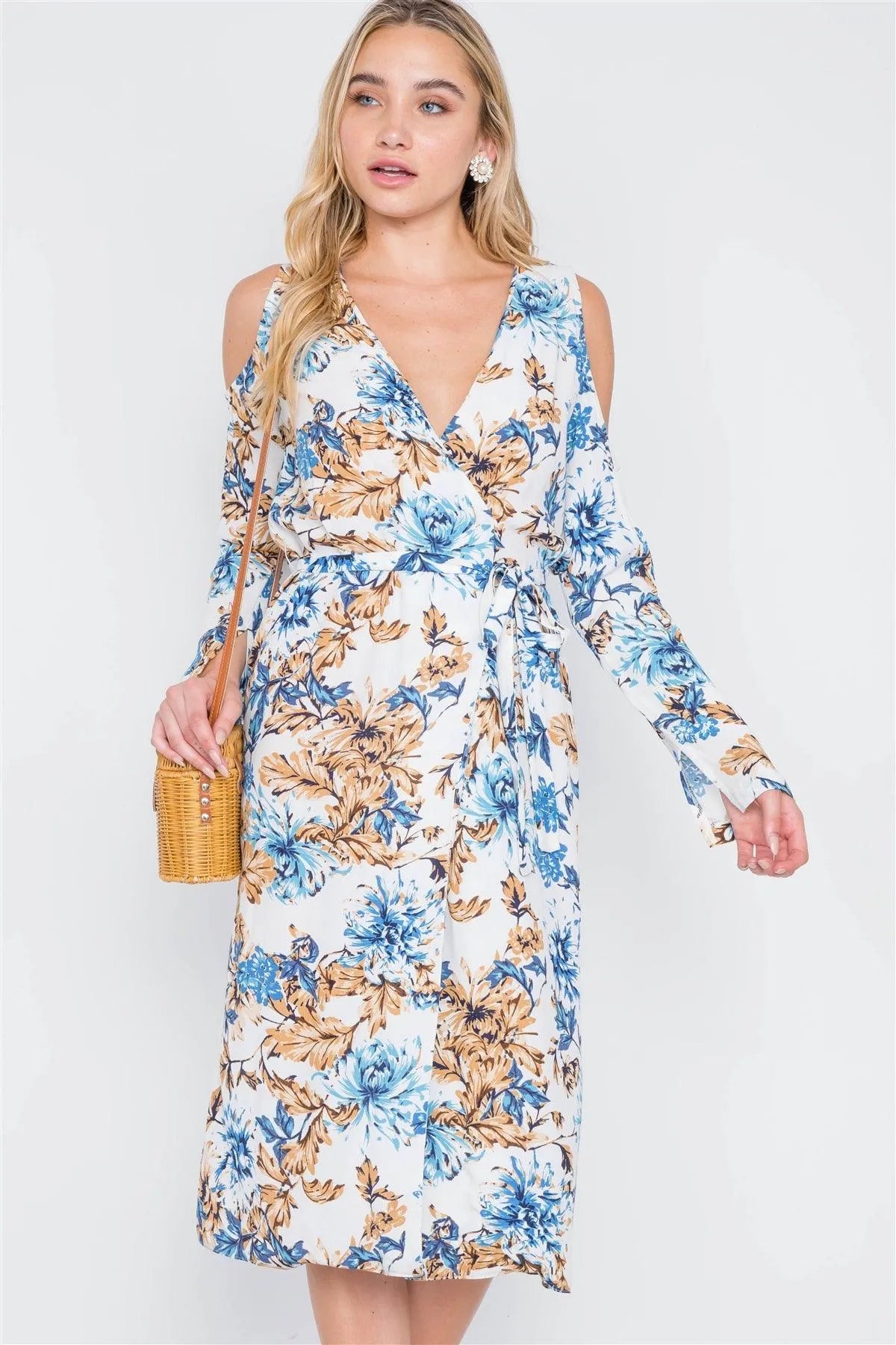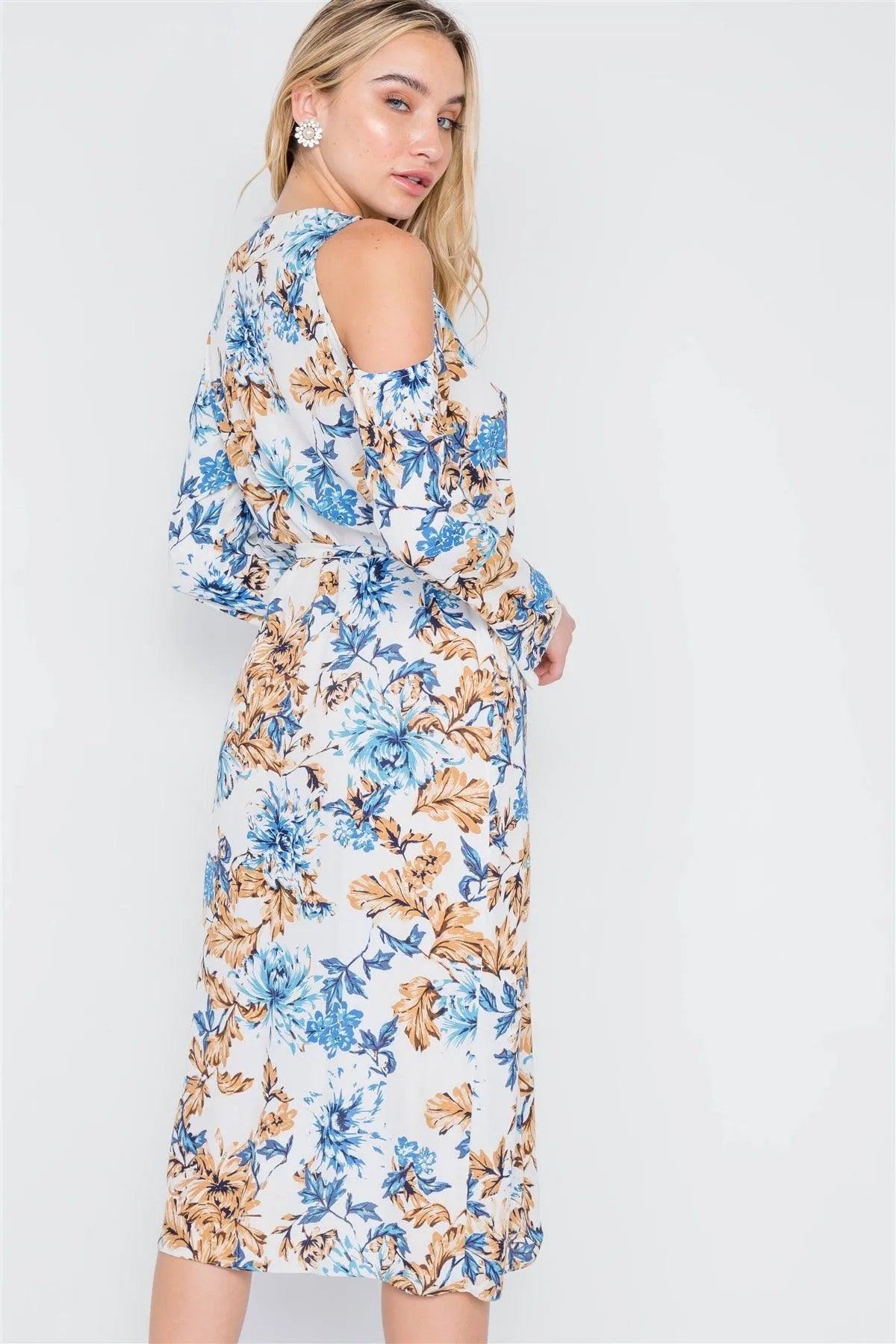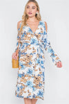 Off White Blue Floral Print Cold Shoulder Midi Dress /2-2-1