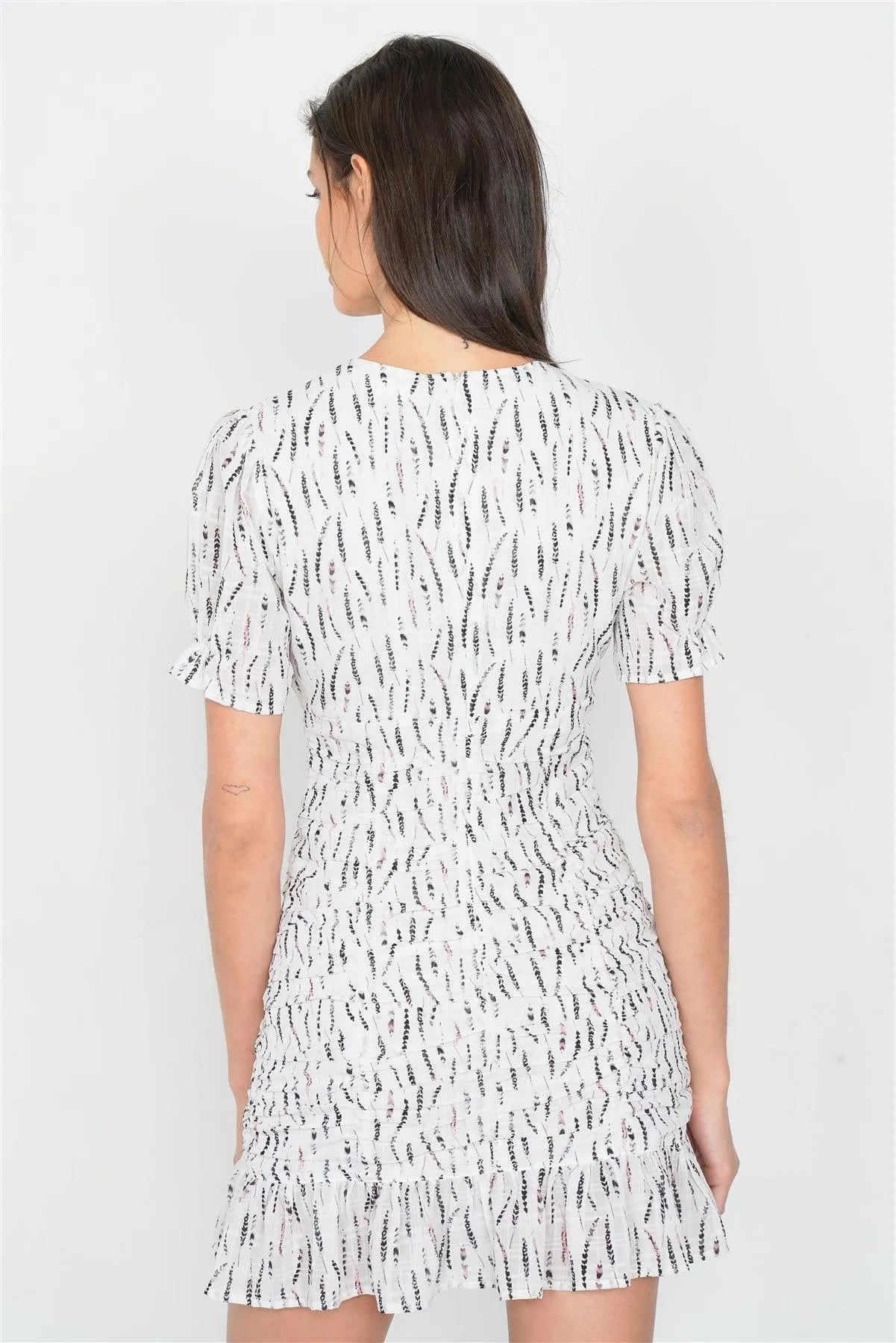 Dress features: mini length, yellow black and white boho print, flounce trim, mermaid hem, ruched cinched waistline, hidden back zipper closure, semi-sheer, chiffon, flounce trim cap sleeve, stretchy, lined.Model is 5'9 wearing a size Small ( Waist: 23.5", Bust: 32B, Hips: 36")Item Measurements: Length: 31" Sleeves: 9" Bust: 30"Item comes pre-packed with hang tagsTrue to sizeAlso available in Mint and Pink