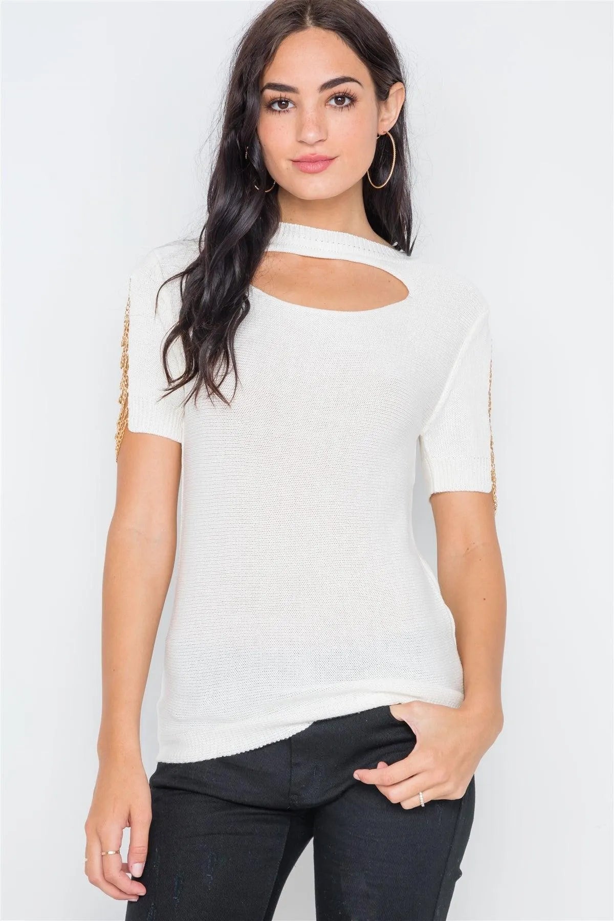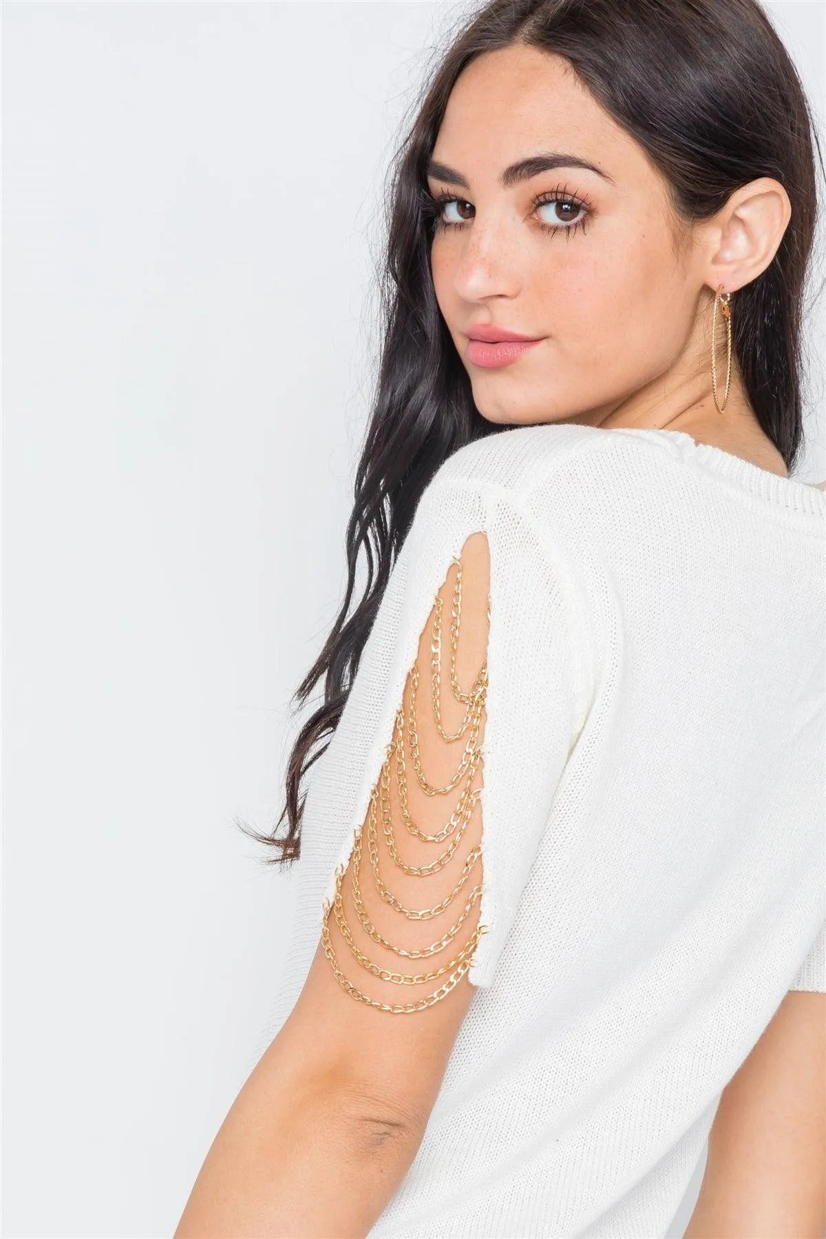 Off White Chain Sleeves Cut Out Knit Top /4-2