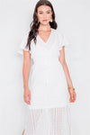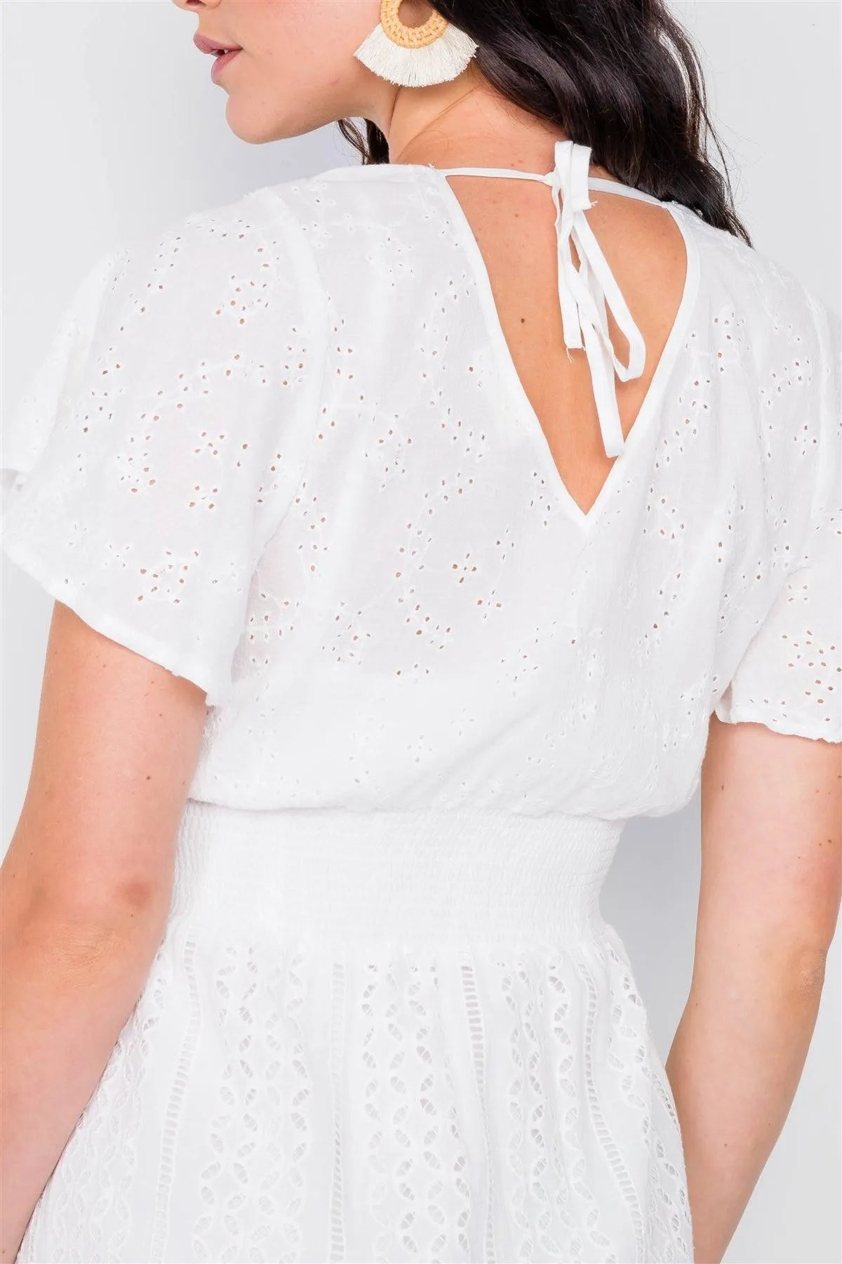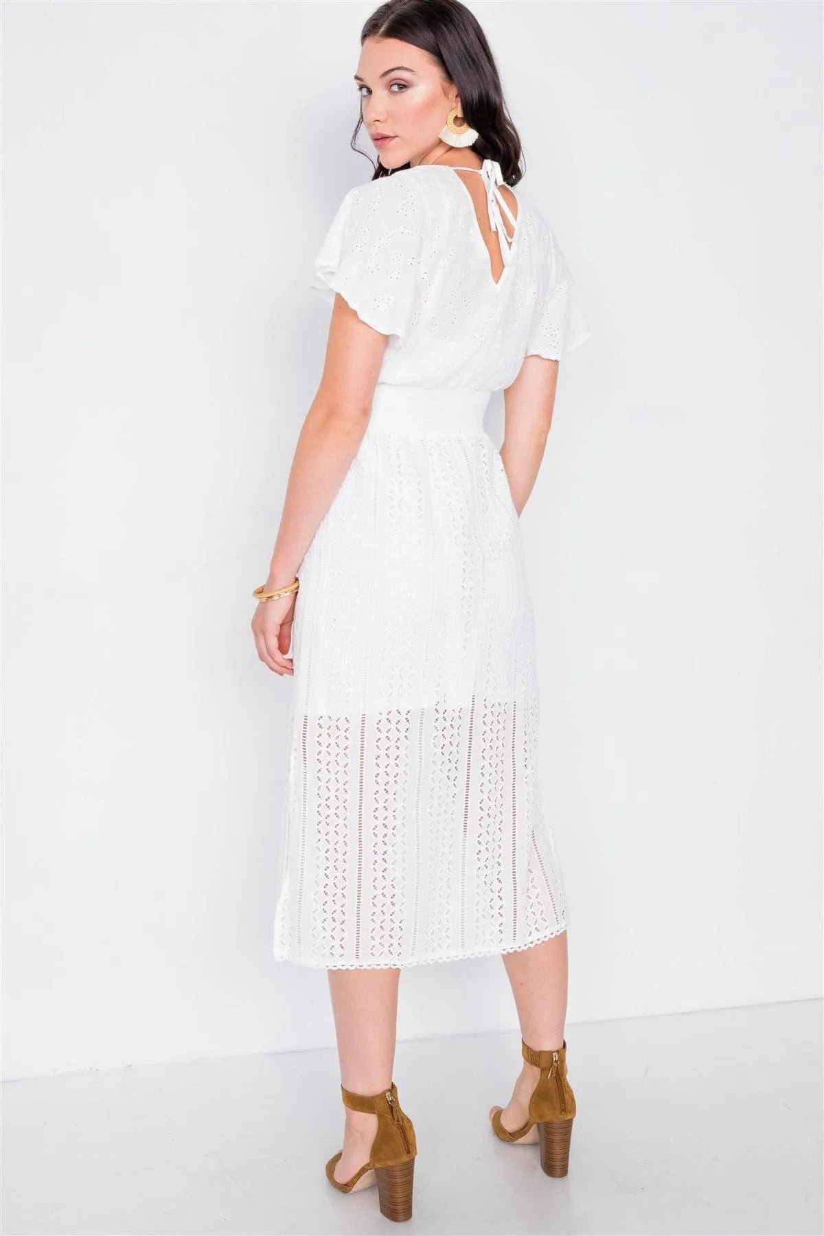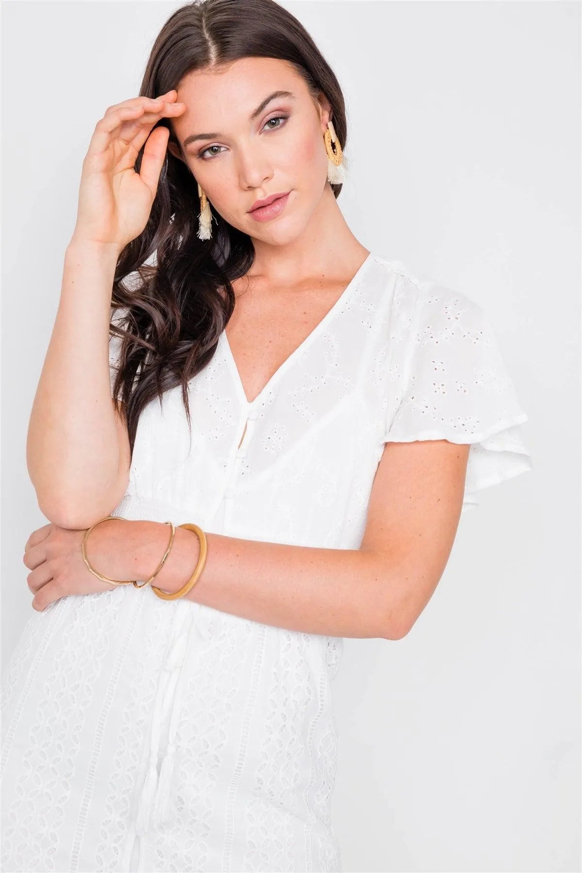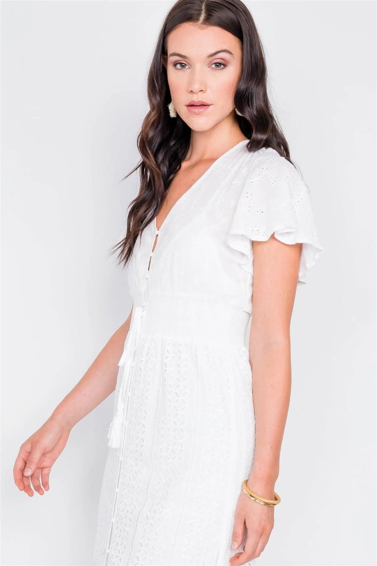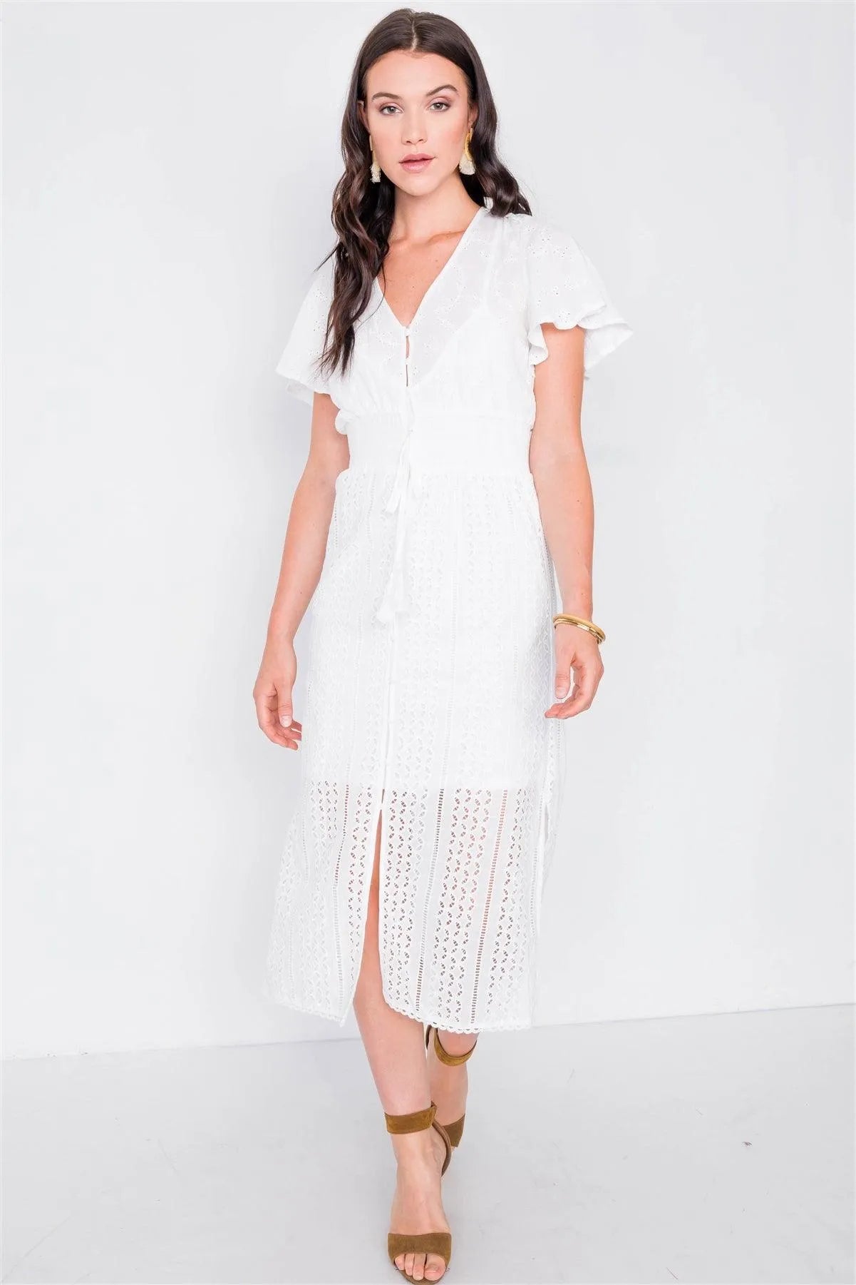 Dress features: Front buttons features, eyelet detailing, slits on both sides, elastic waist, waist tie, back tie feature, back v-neck, flounce sleeves, lined.Model is 5'10 and wearing Small (Waist: 24", Bust: 32B, Hips: 36")Item Measurements: Length: 50", Bust: 40" , Sleeves 10"True to size