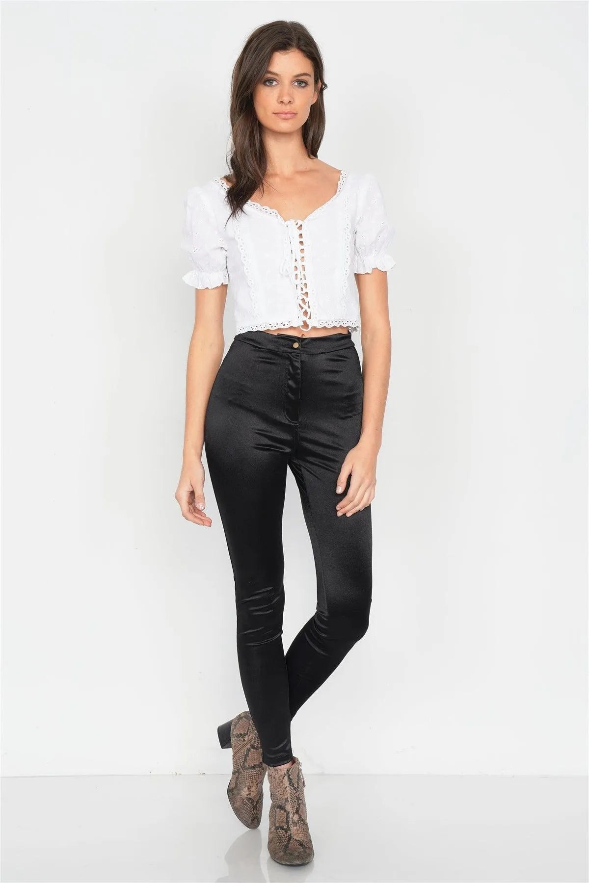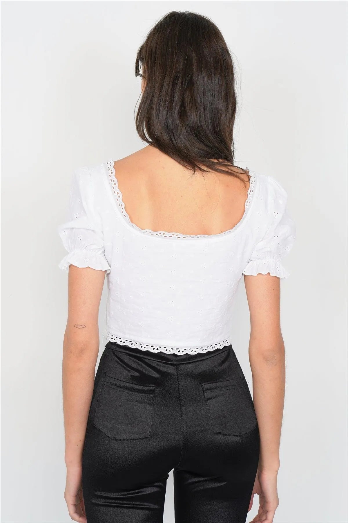 Off-White Eyelet V-Neck Lace Up Puff Sleeve Boho Crop Top /1-1-1