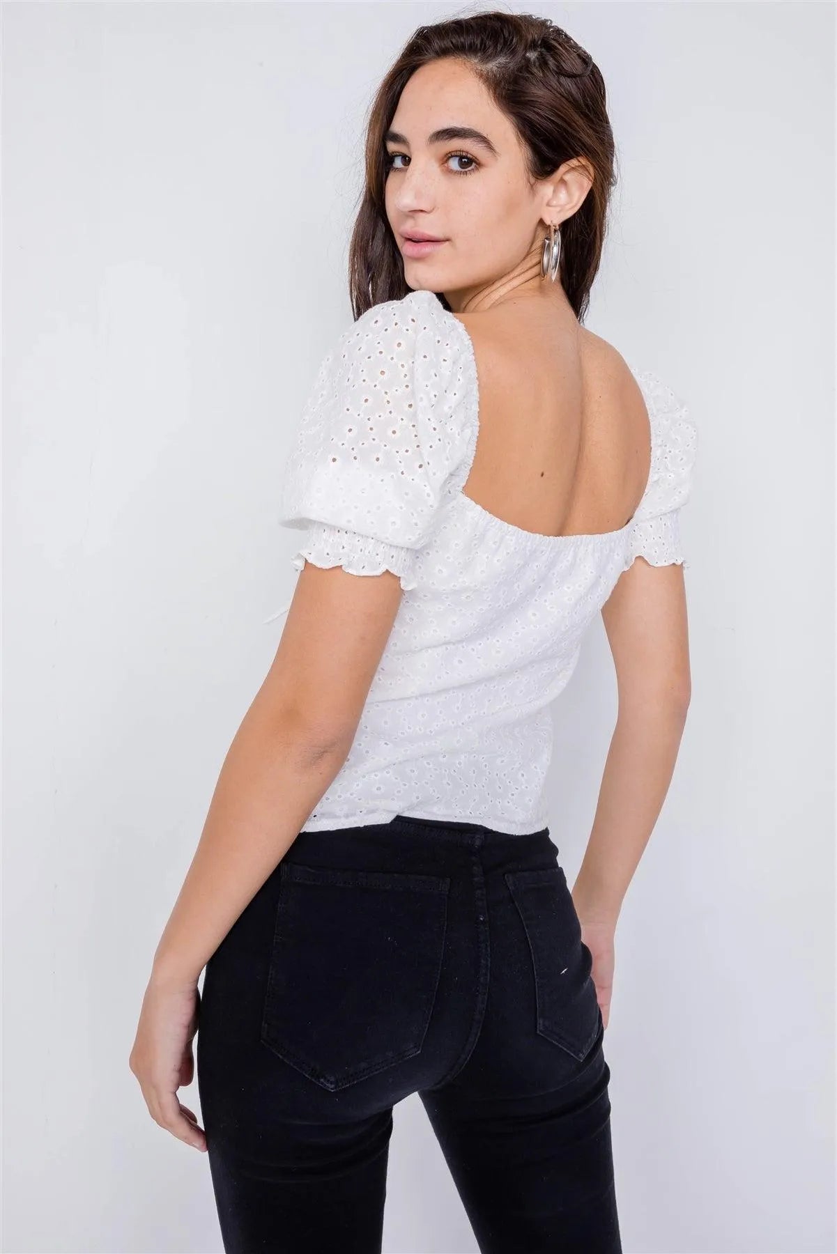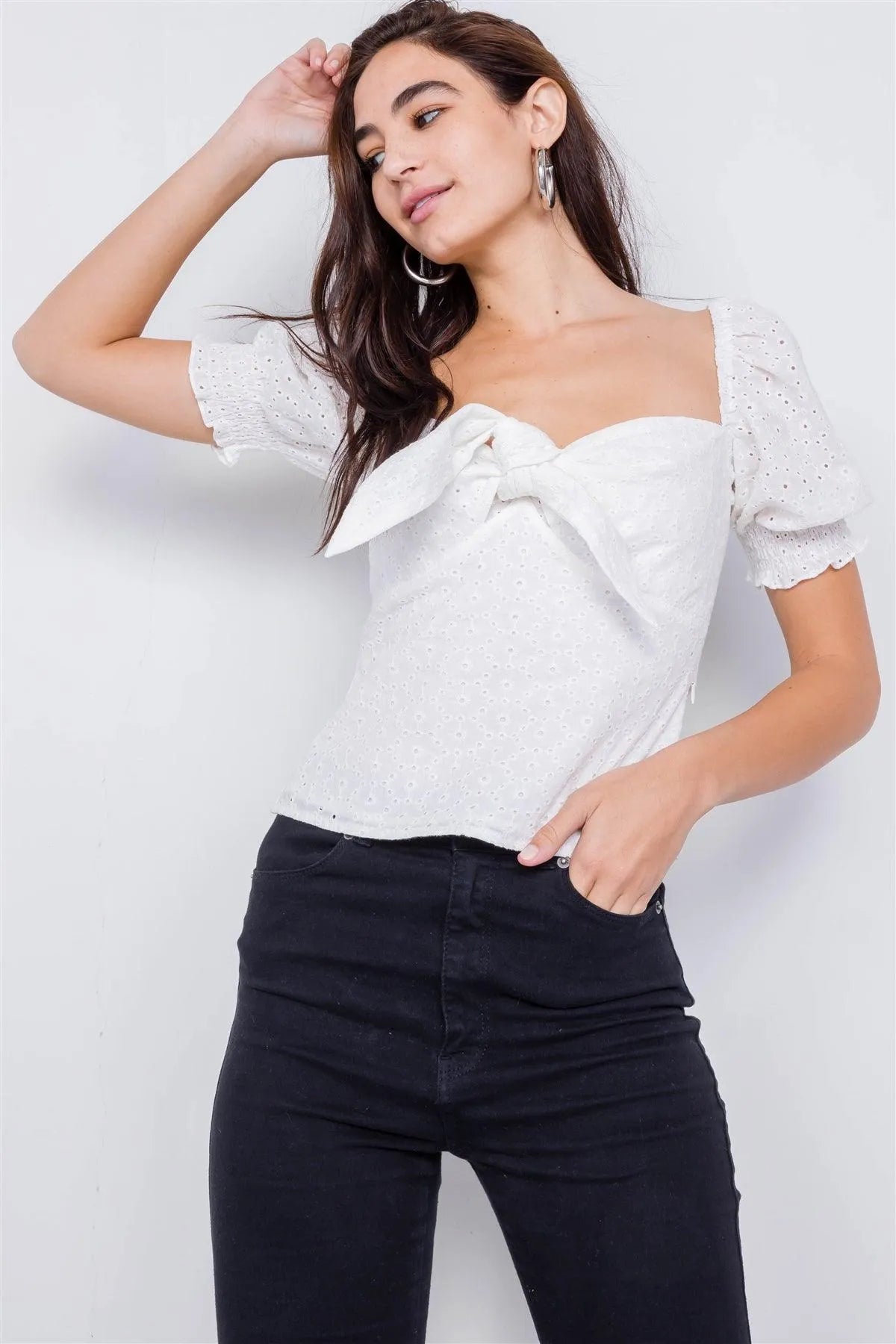 Off-White Floral Eyelet Office Chic Square Neck Front Bow Top /4-2-1