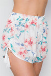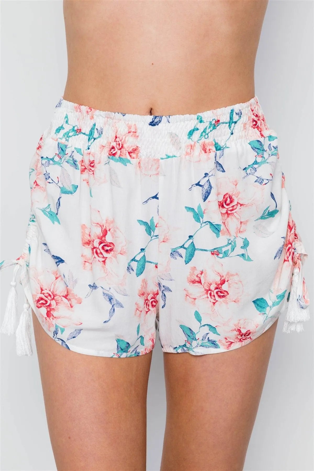 Shorts features: high waist, elastic waist, tie tassle sides, unlined, allover floral print, boho vibes.Model is 5'9" and wearing small (Waist: 28", Bust: 34C", Hips: 36" )Item Measurements: Length: 14", Waist: 30"