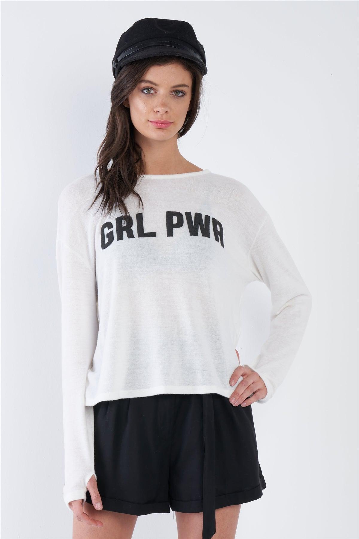 Top Features: "GRL PWR" logo, solid, black print, semi-sheer, casual, thumb hole, crop length, drop shoulder, super soft, unlined, stretchy.Model is 5'9 wearing a size Small ( Waist: 23.5", Bust: 32B, Hips: 36")Item Measurements: Length: 21", Bust: 22" , Sleeve: 23"Item comes pre-packed True to Size