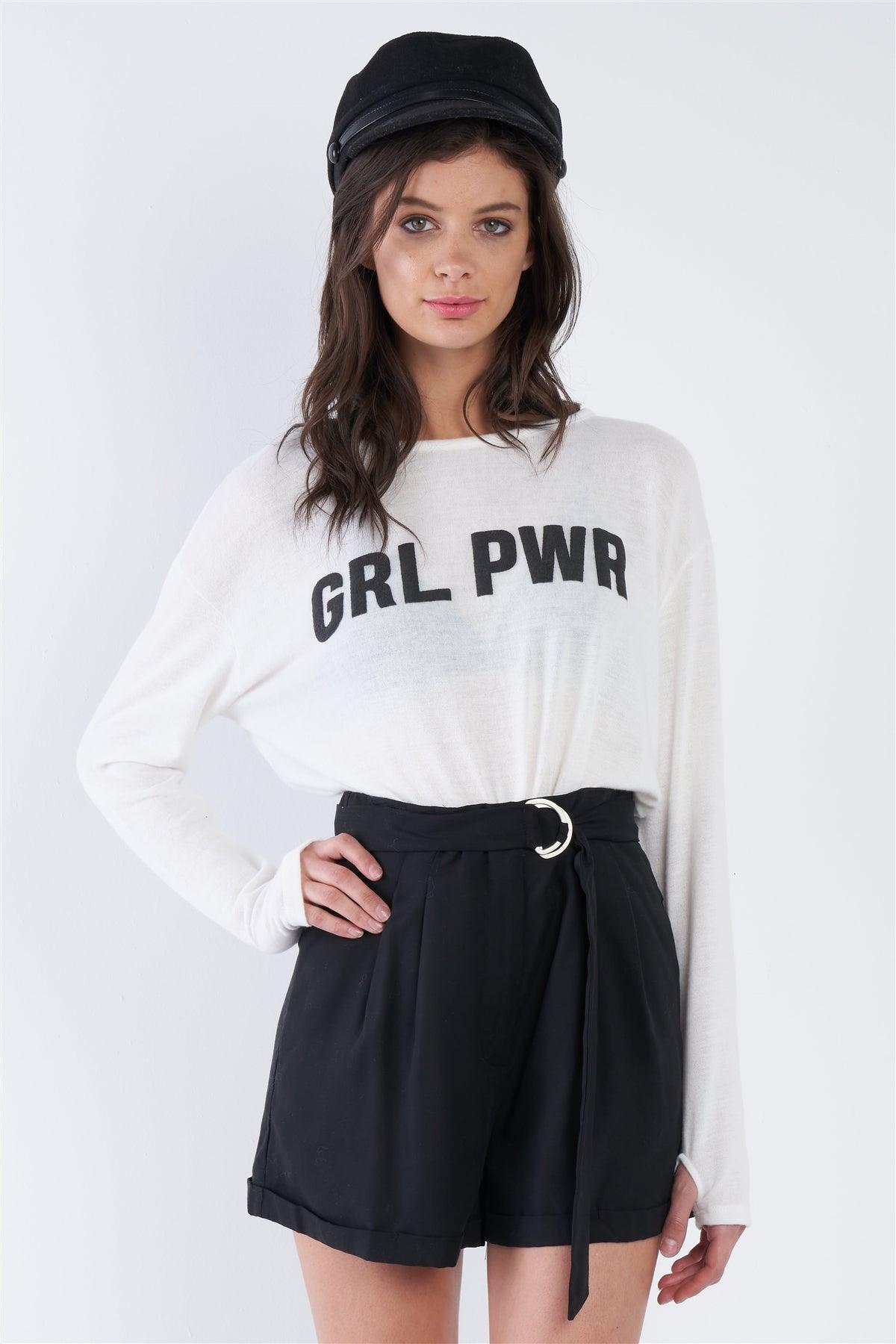 Top Features: "GRL PWR" logo, solid, black print, semi-sheer, casual, thumb hole, crop length, drop shoulder, super soft, unlined, stretchy.Model is 5'9 wearing a size Small ( Waist: 23.5", Bust: 32B, Hips: 36")Item Measurements: Length: 21", Bust: 22" , Sleeve: 23"Item comes pre-packed True to Size