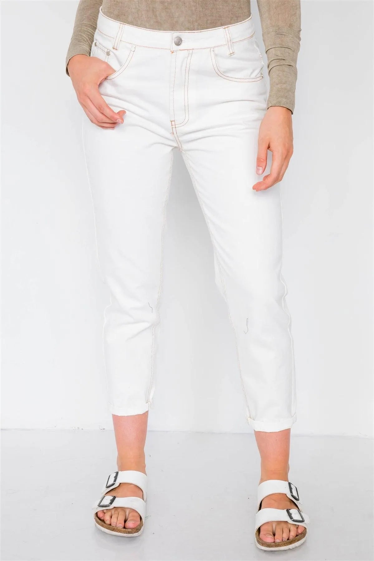 Pant features: no stretch, solid white, brown stitching detailing, front and back pockets, button & zipper front closure. Model is 5'7 wearing a size Small ( Waist: 23.5", Bust: 32B, Hips: 36")Model is 5'10 and wearing Small (Waist: 24", Bust: 32B, Hips: 36")Item Measurements: Length: 37", Waist 28"True to size