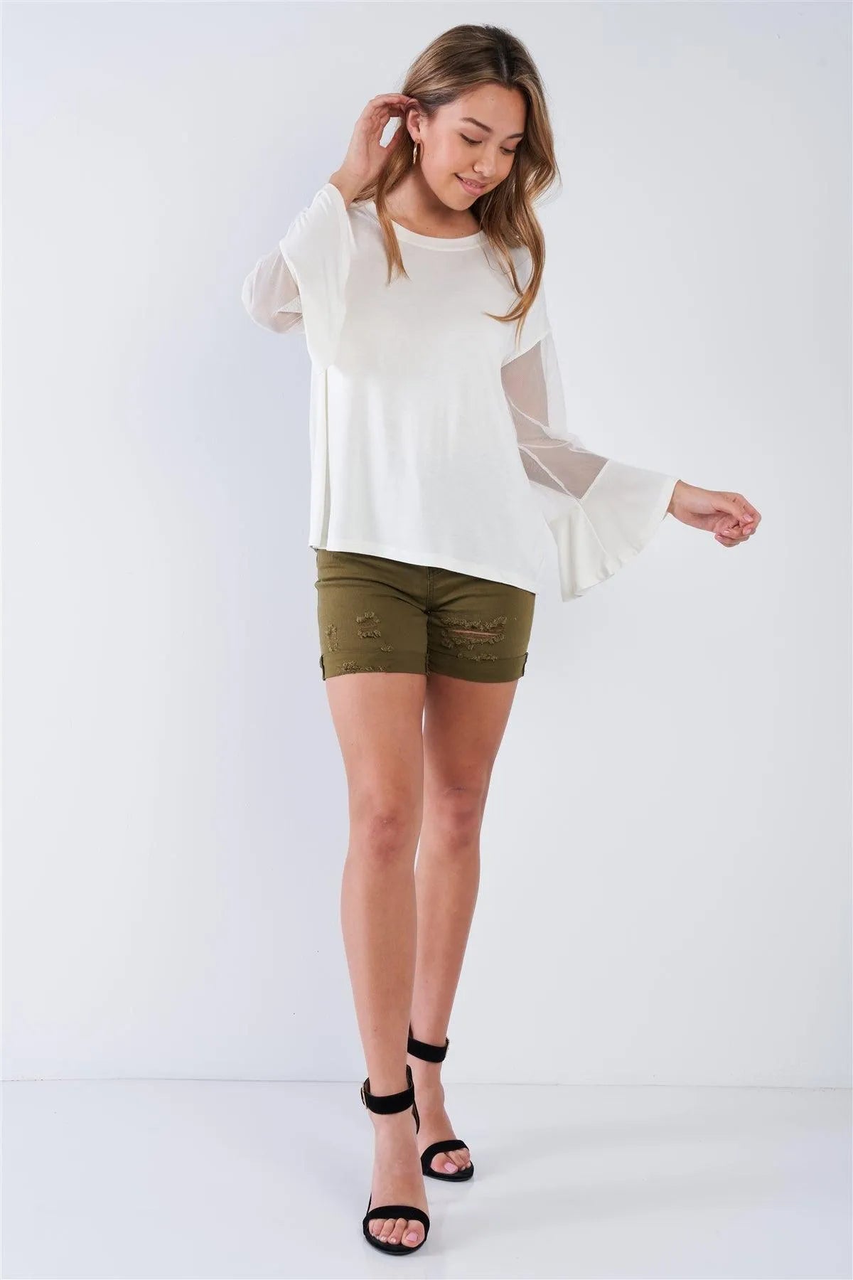 Top Features: Solid off-white, long mesh sleeve, bell hem sleeve, unlined, soft, stretchy, casual Model is 5'10" and wearing a Small (Waist 26", Bust 33B", Hips 35")Item Measurements: Length: 24" Bust 45" Item comes pre-packed with hang tags True to size