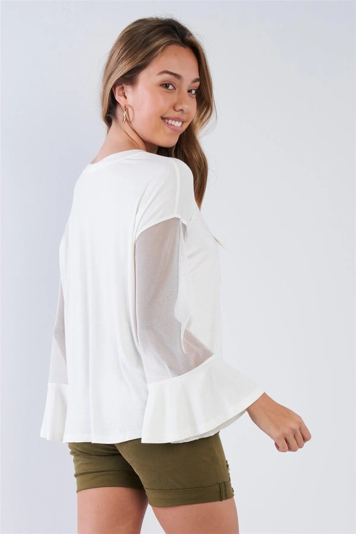 Top Features: Solid off-white, long mesh sleeve, bell hem sleeve, unlined, soft, stretchy, casual Model is 5'10" and wearing a Small (Waist 26", Bust 33B", Hips 35")Item Measurements: Length: 24" Bust 45"Item comes pre-packed True to size