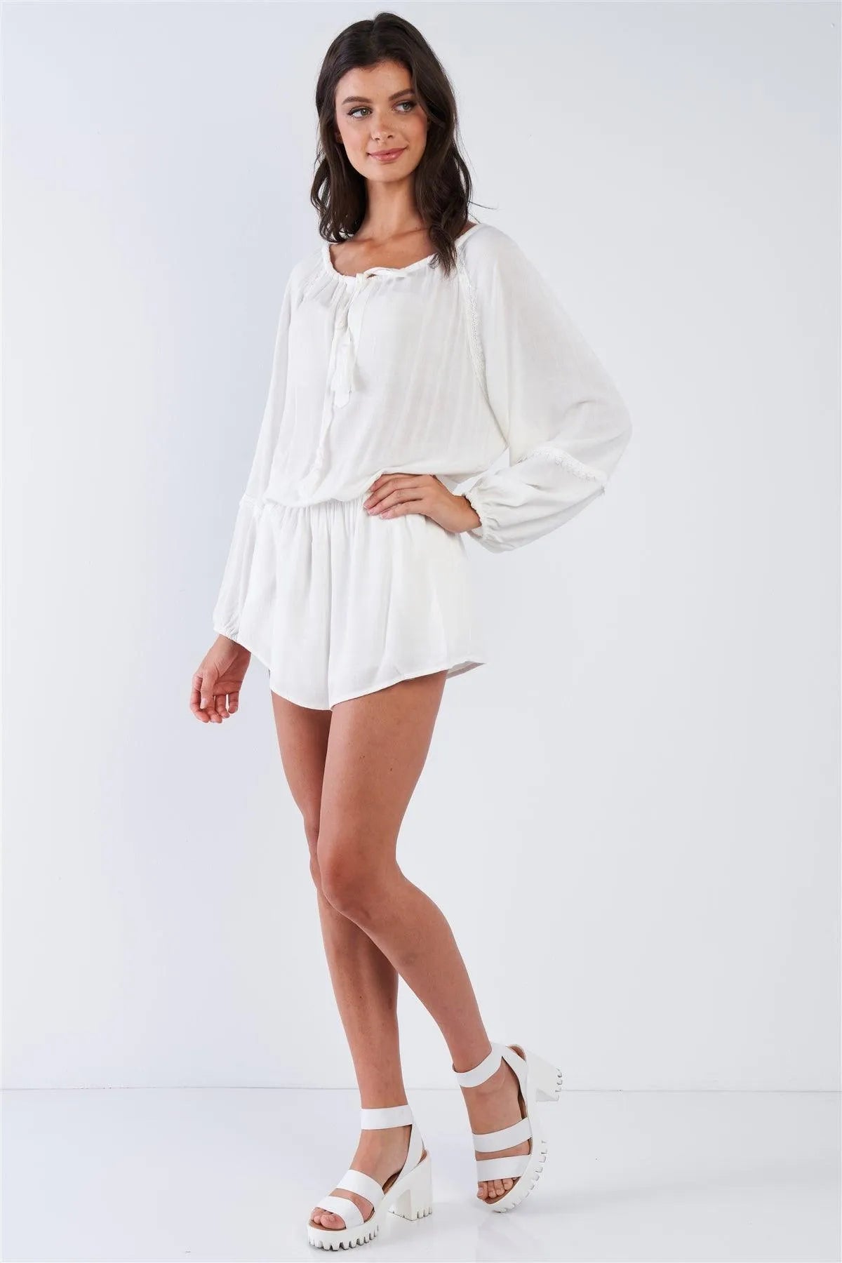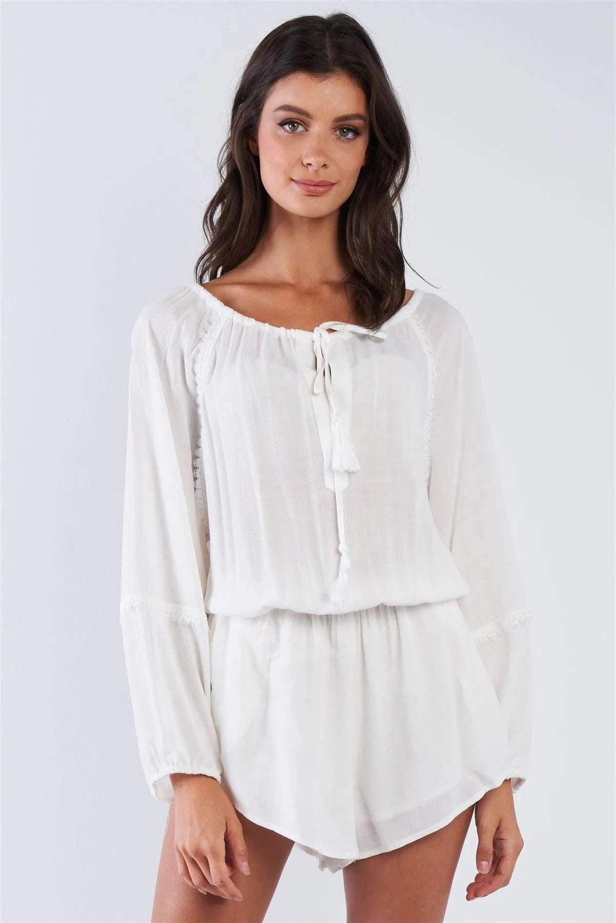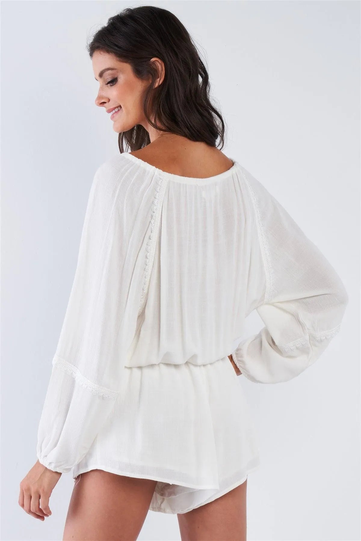 Off White Long Sleeve Loose Fit Elastic Waisted Boho Lace Chiffon Romper /3-2-1