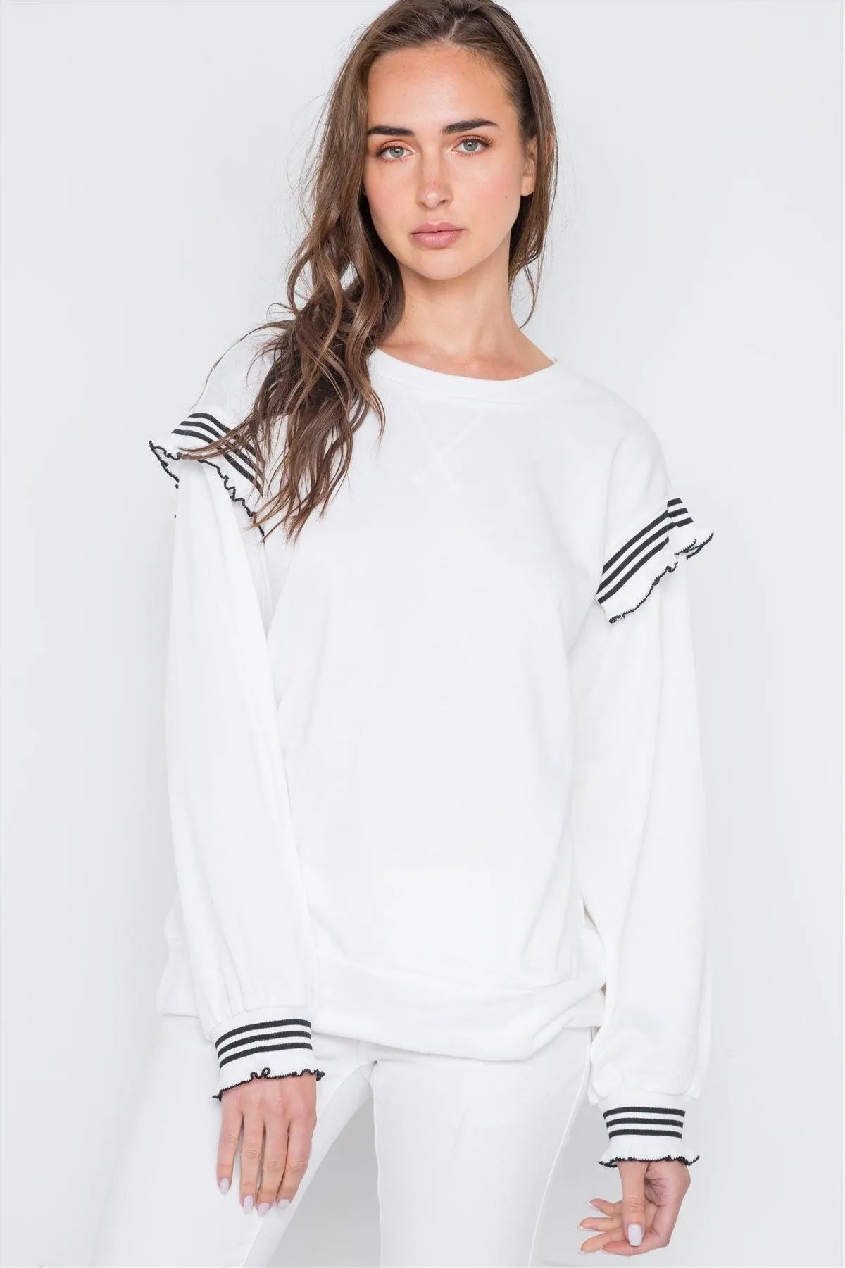 Sweater features: round neckline, long sleeves, dropped shoulders, stripe ruffle trim detailing at shoulders and cuffs, solidModel is 5'9 wearing a size Small ( Waist: 26", Bust: 34B, Hips: 35")Item measurements: Length: 27", Bust: 40", Sleeve Length: 23"True to size