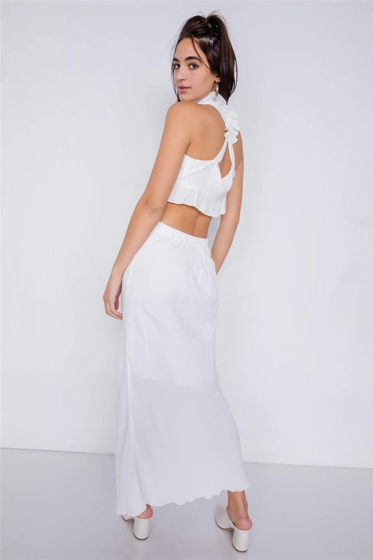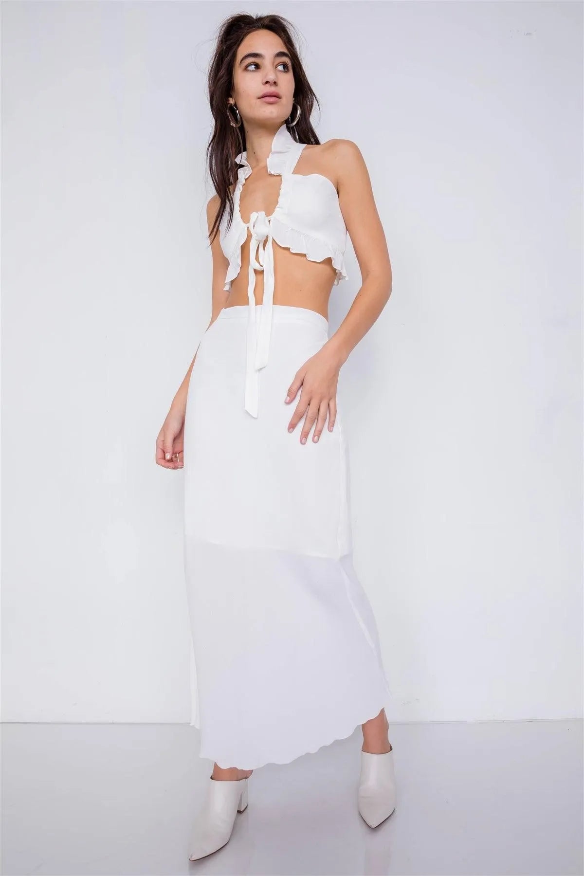 Off-White Mini Boho Lace Up Crop Top & High-Waist Frill Trim Maxi Skirt Set /4-2-1