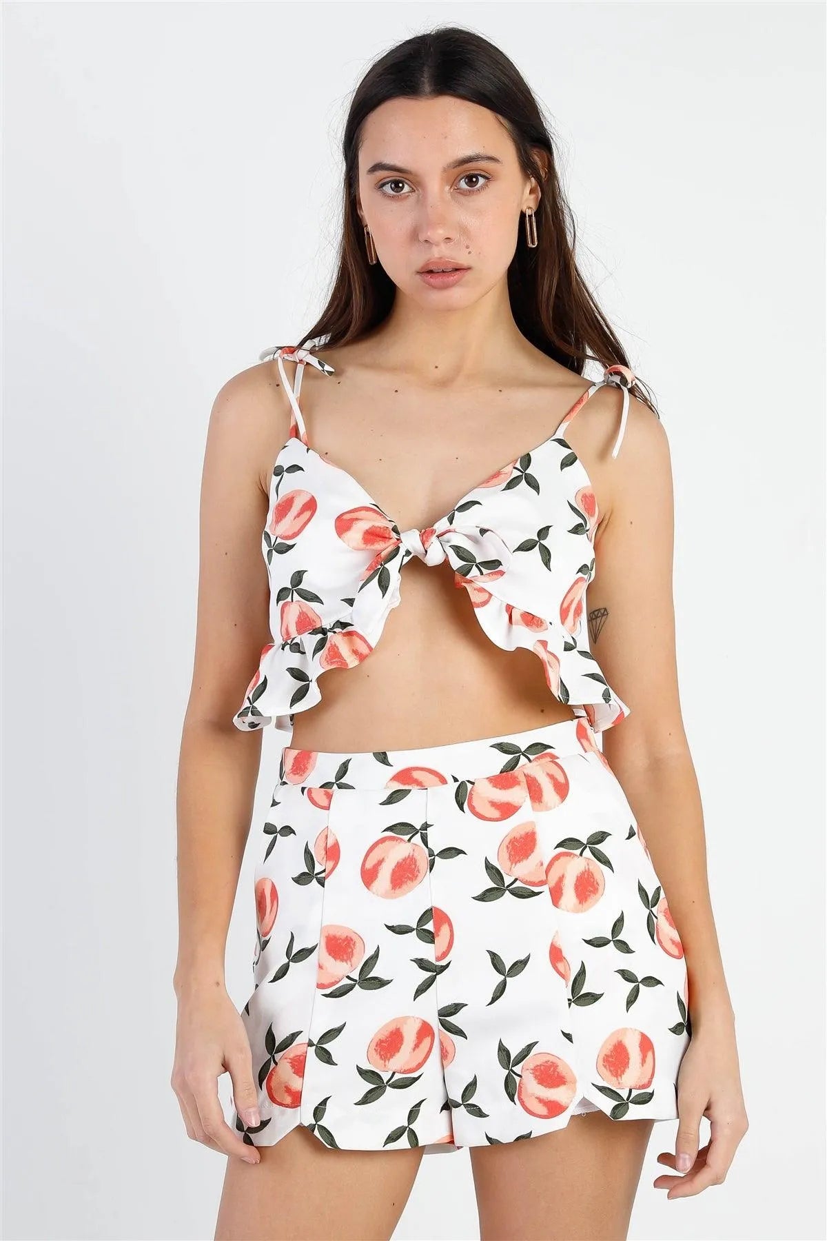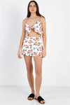 🖤 Item features: Off-white, peach print, self-tie front detail, ruffle hem, v-neckline, sleeveless, self-tie straps, cropped length top, high waist shorts, front slits, two side pockets, side hidden zipper, lined, non-stretchy, non-sheer, casual, cute, girlish, spring/summer look