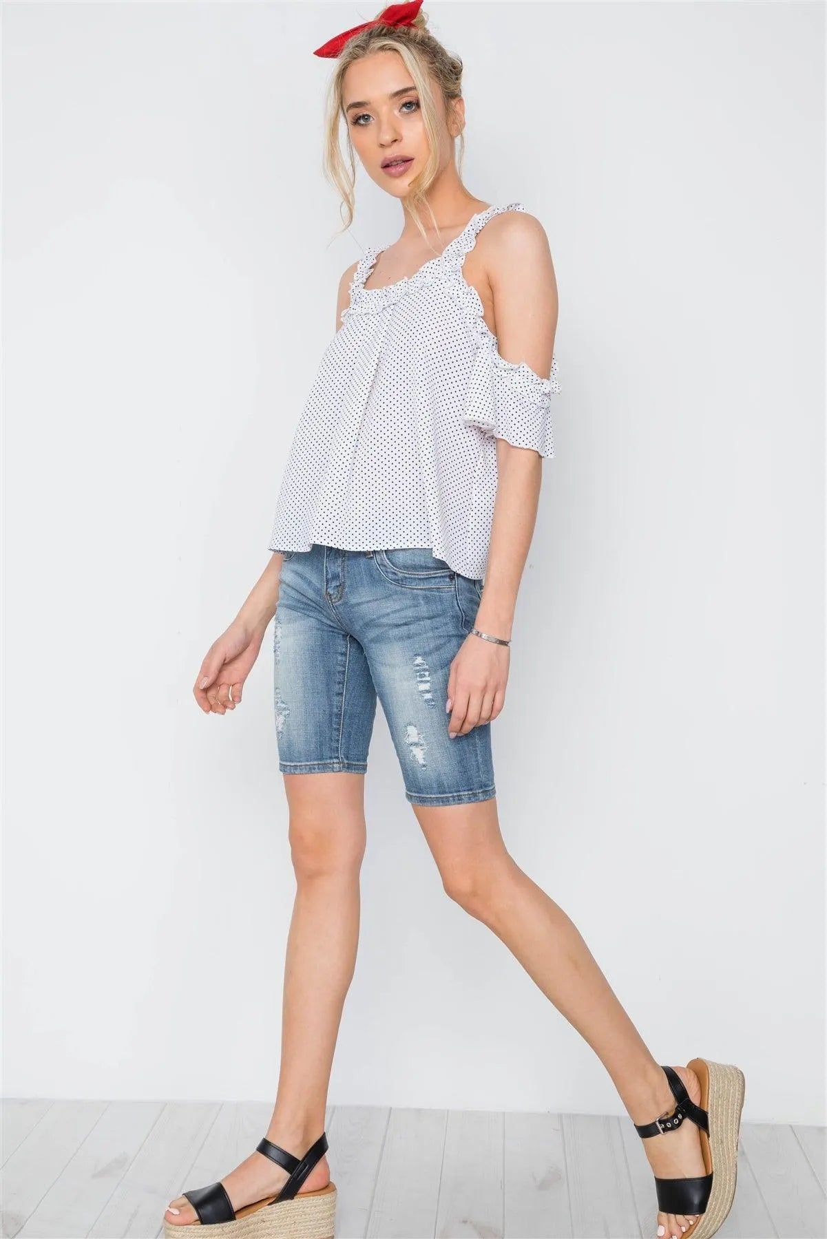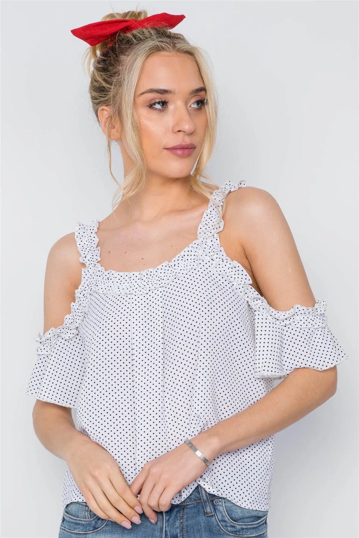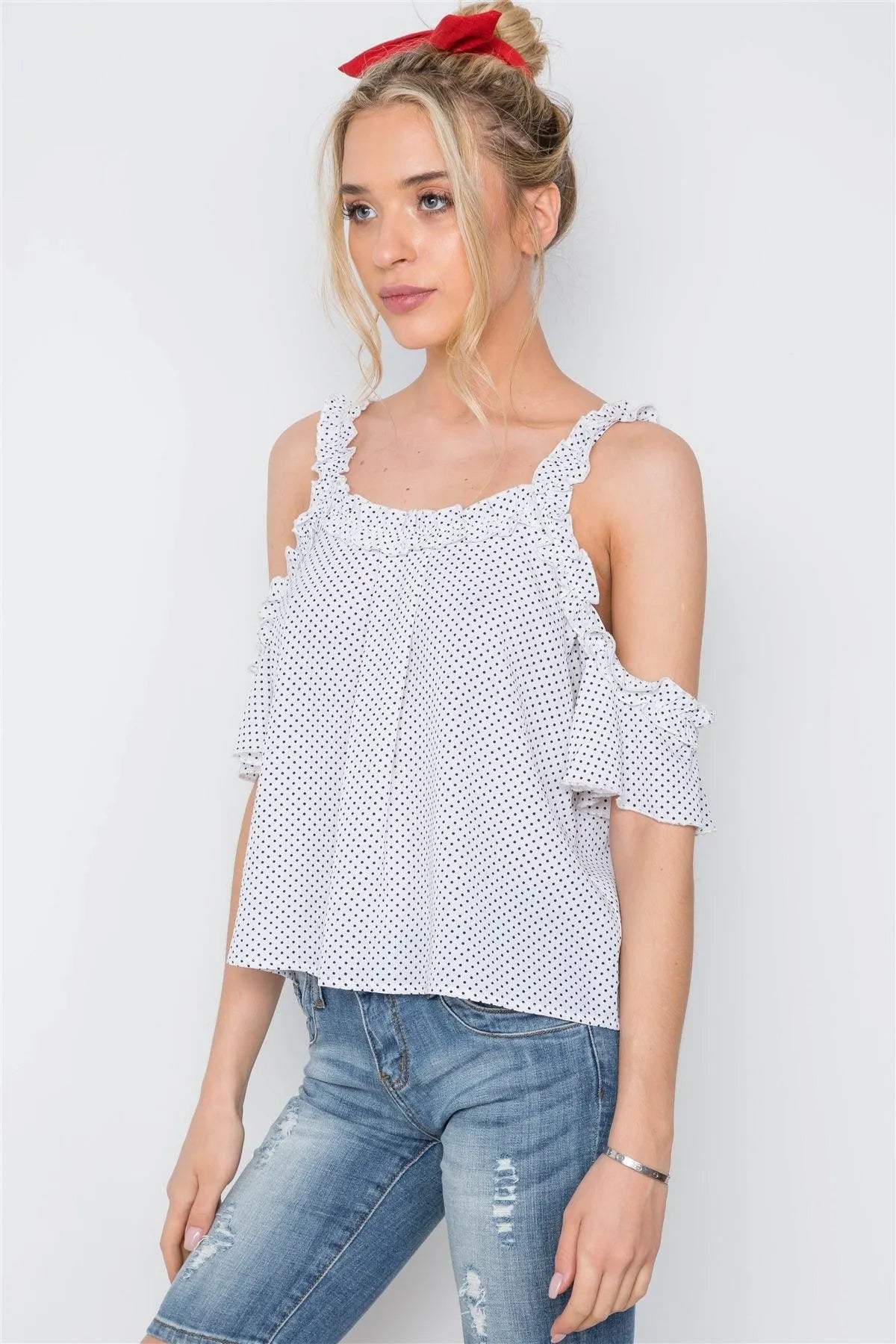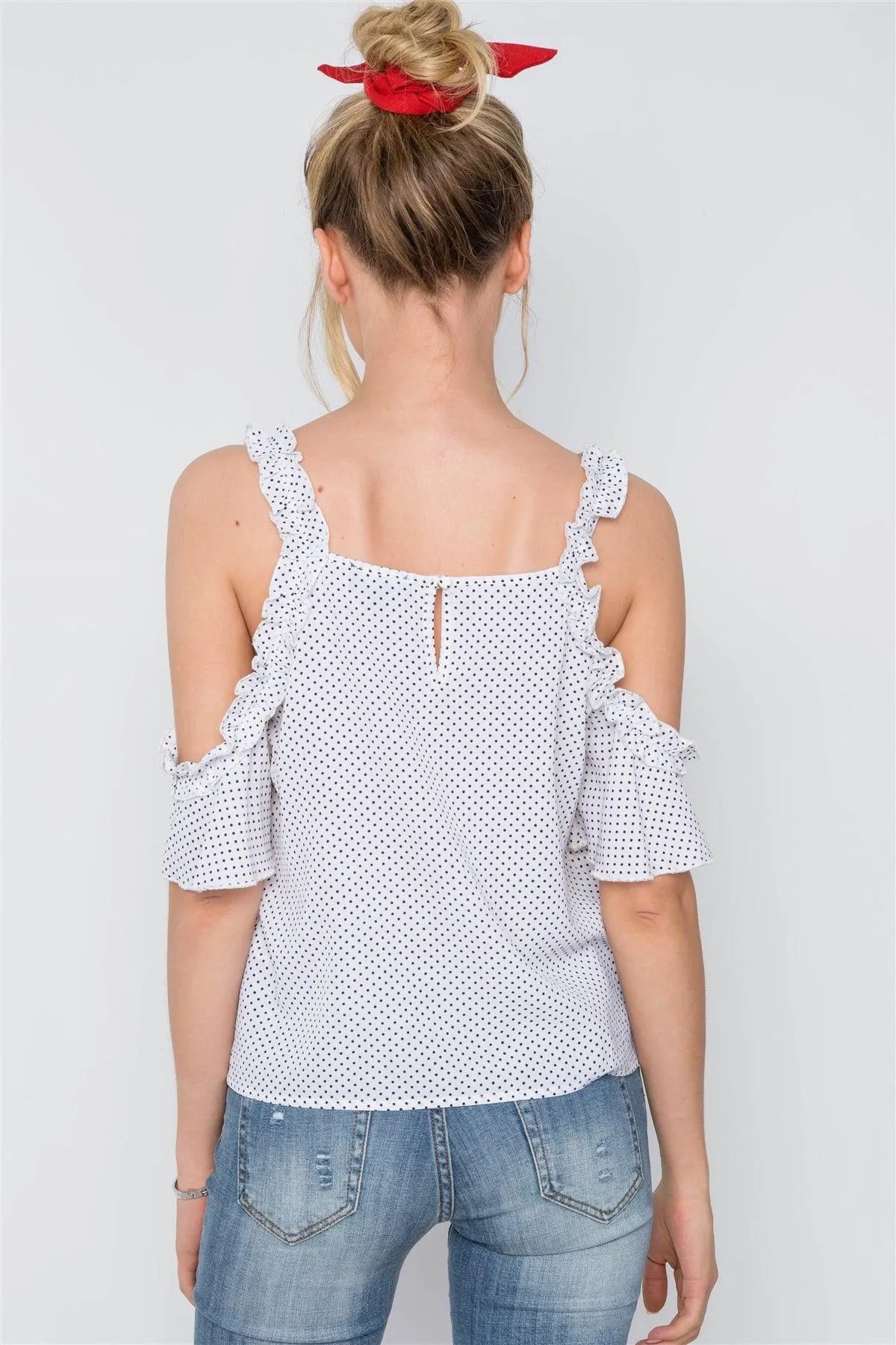 Off White Polka Dot Cold Shoulder Ruffle Top /2-2-2
