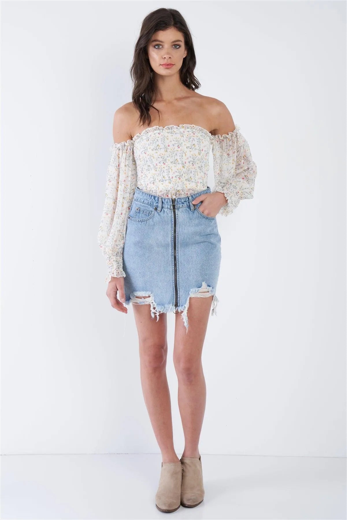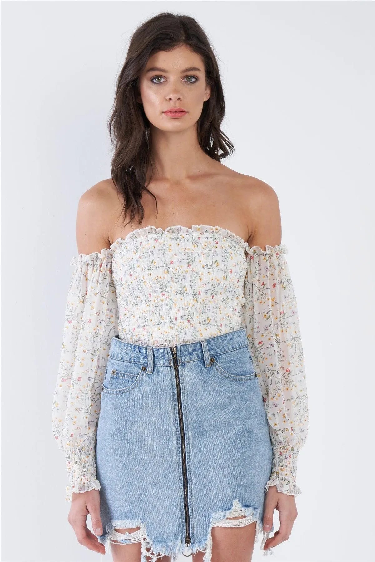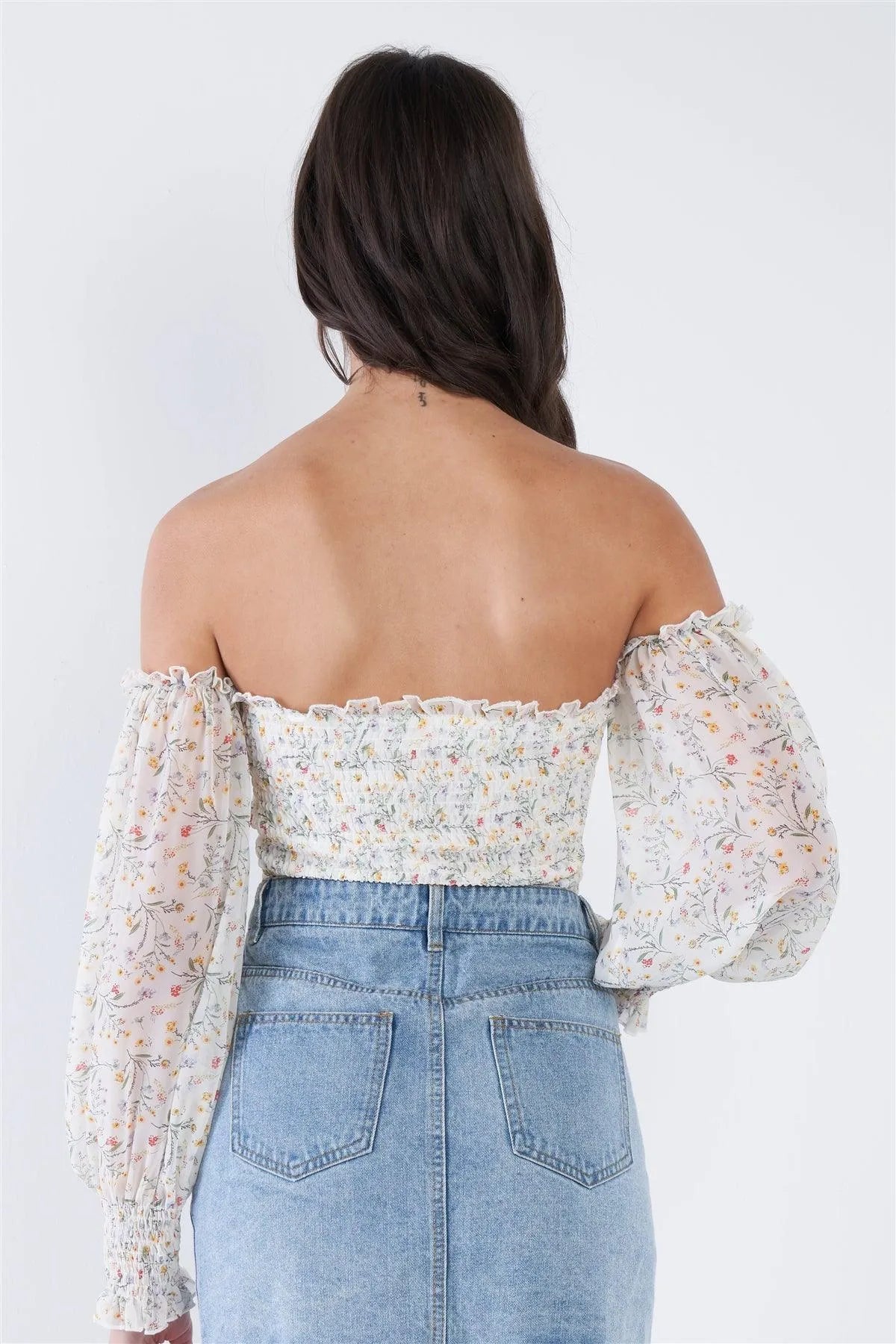 Off-White Sheer Floral Off-The-Shoulder Peplum Top /3-2-1