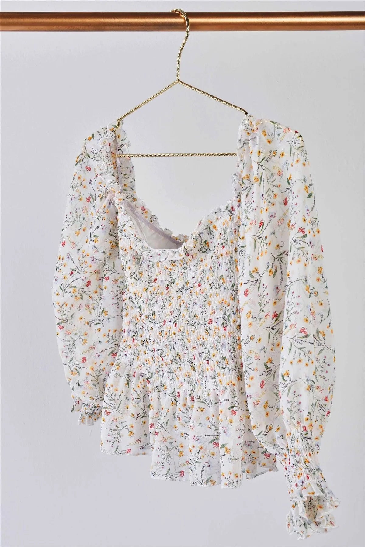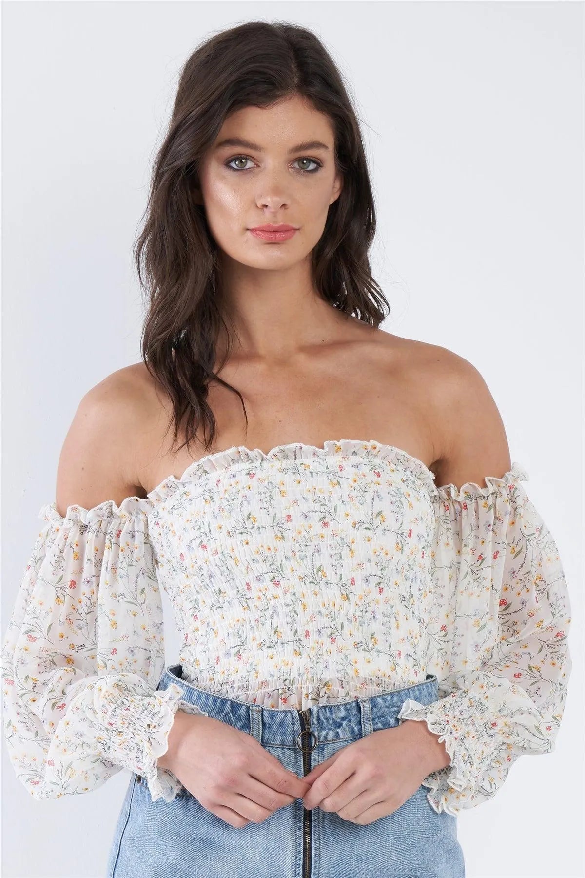 Top Features: square neckline, sheer, red blue yellow pink green and white floral print, off-the-shoulder, flounce hem, peplum, chic, classic, sheer puff sleeve, elastic cinched vintage sleeve cuff, ruched bodice, summer, lined, stretchy.Model is 5'9 wearing a size Small ( Waist: 23.5", Bust: 32B, Hips: 36")Item Measurements: Length: 14.5", Bust: 22" , Sleeve: 20"Item comes pre-packed with hang tagsTrue to size