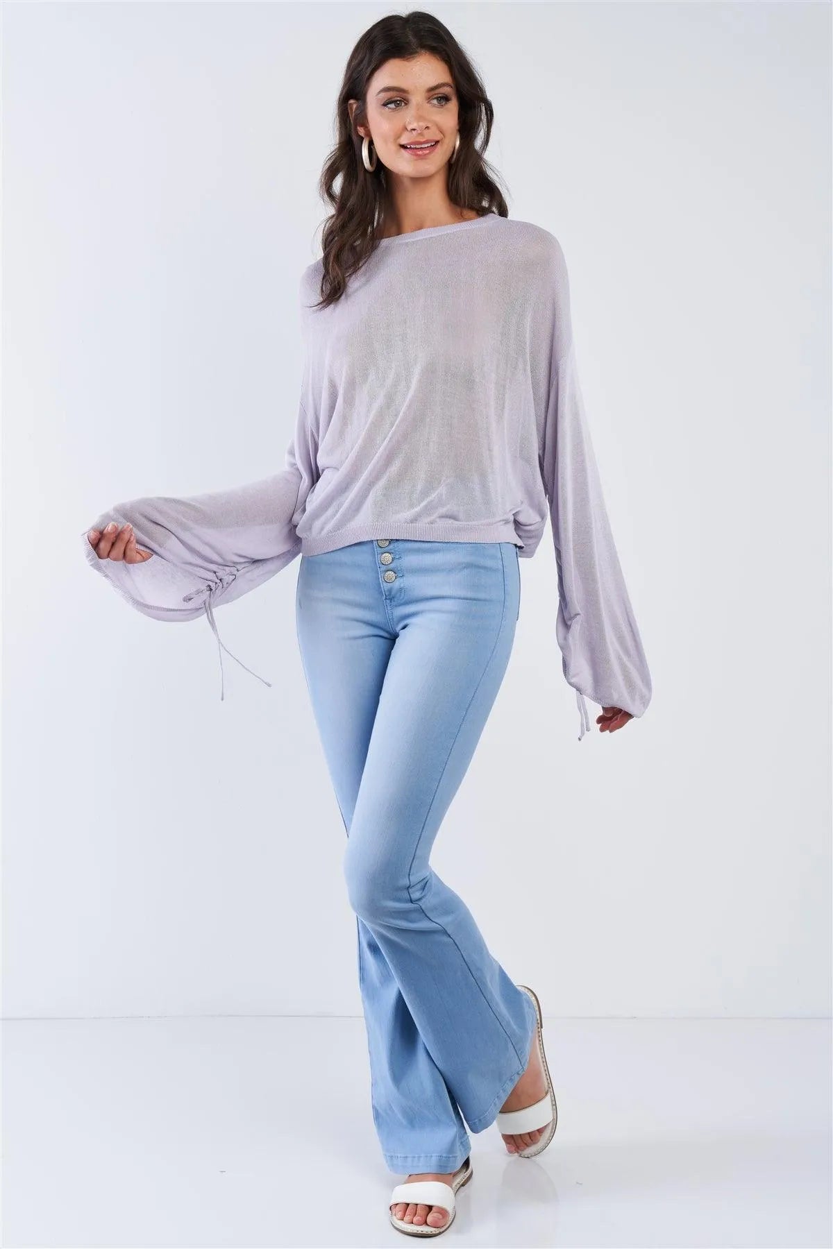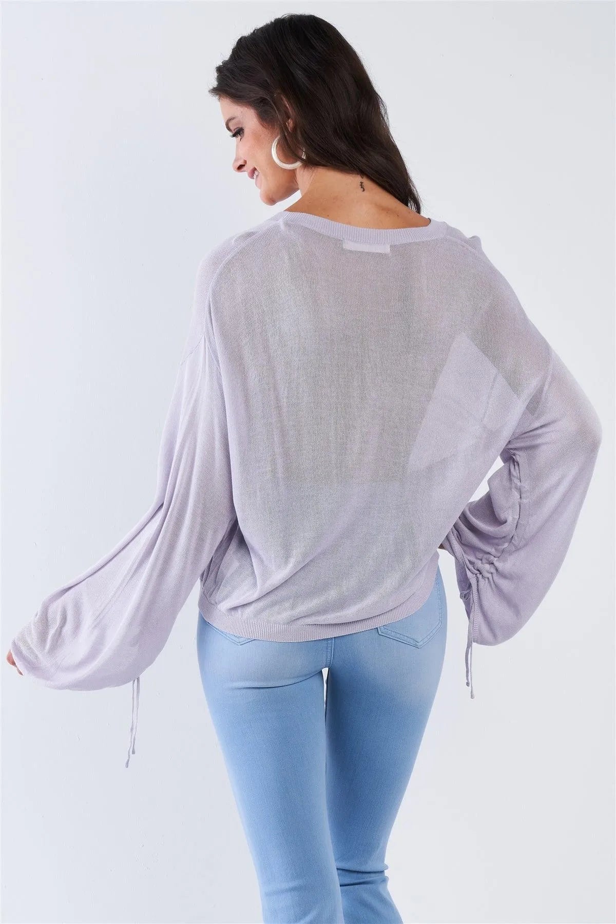 Top features: Solid, off-white, sheer, unlined, stretchy, loose fit, long sleeve, draw string sleeve, knitted, topModel is 5'9 wearing a size Small (Waist: 24", Bust: 32A, Hips: 34")Item Measurements: Length: 23", Bust: 46"True to size