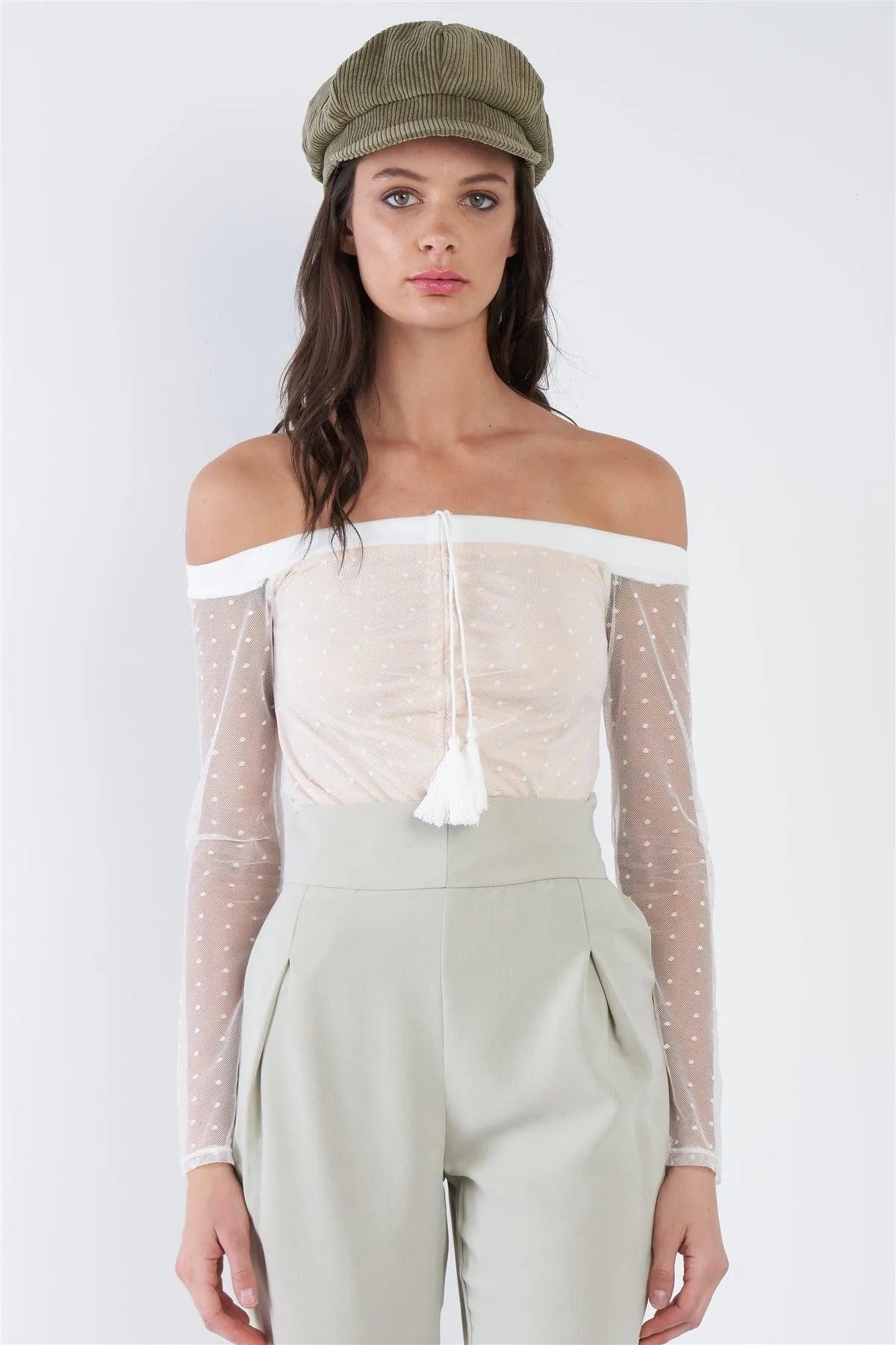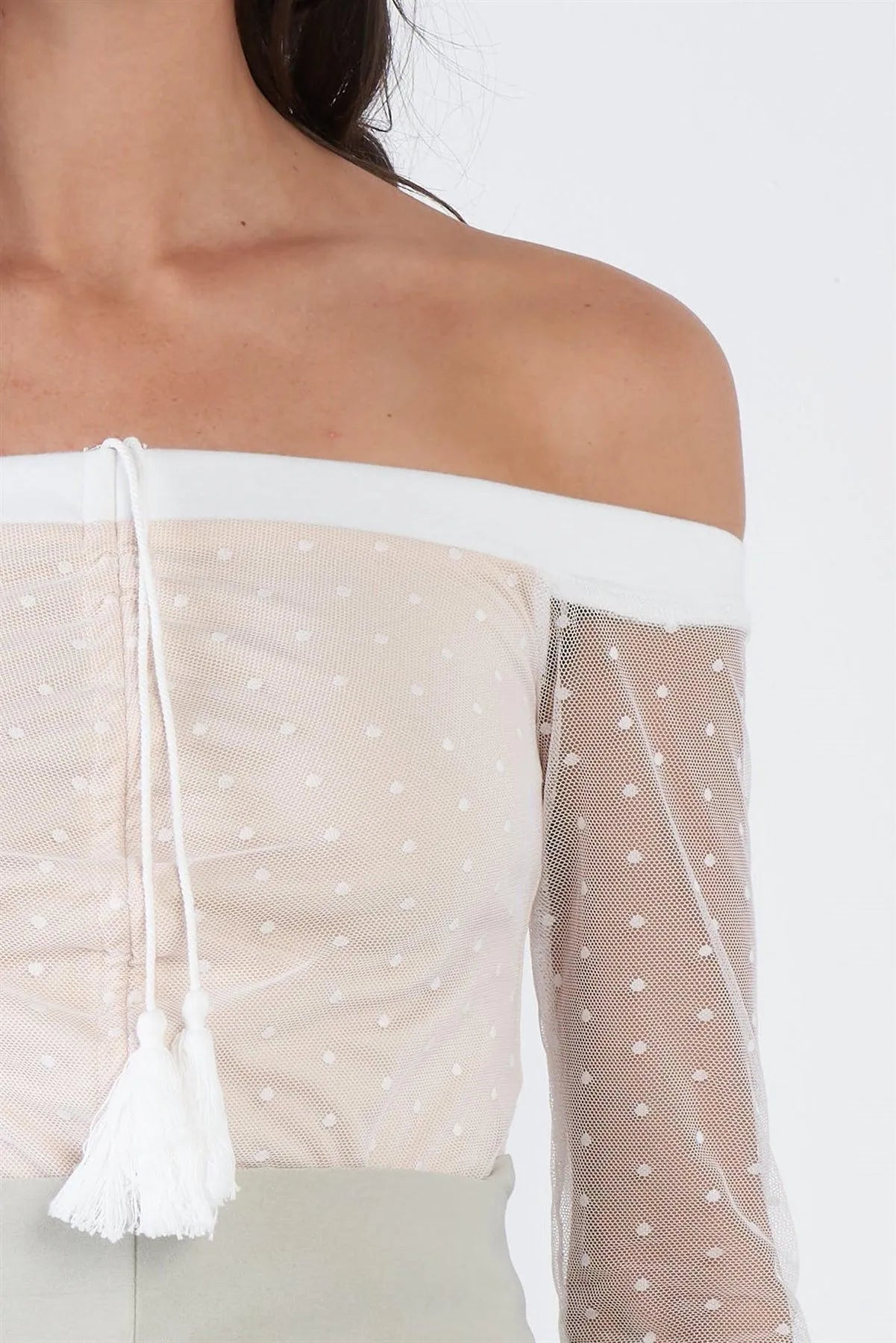 Off-White Sheer Off-The-Shoulder Polkadot Tassel Top /2-2-1