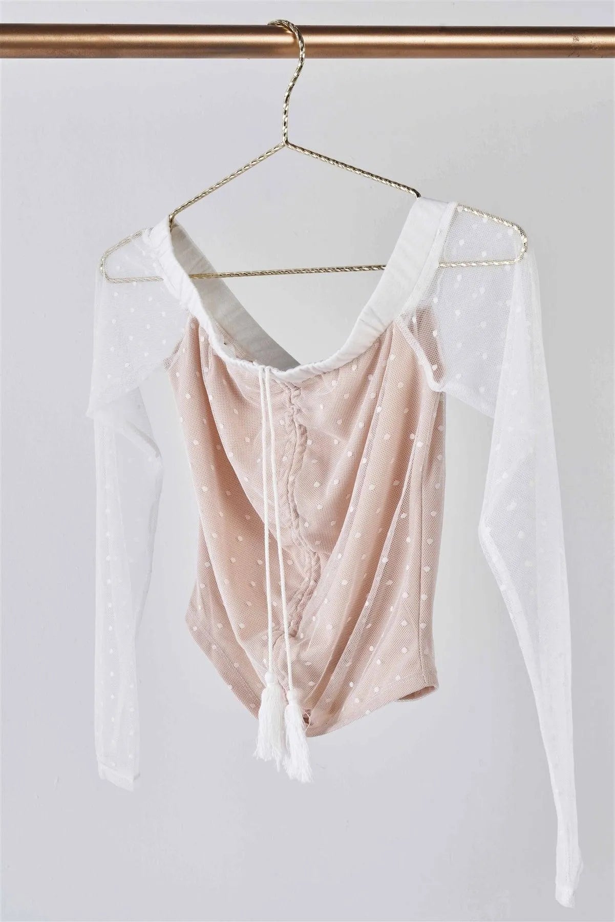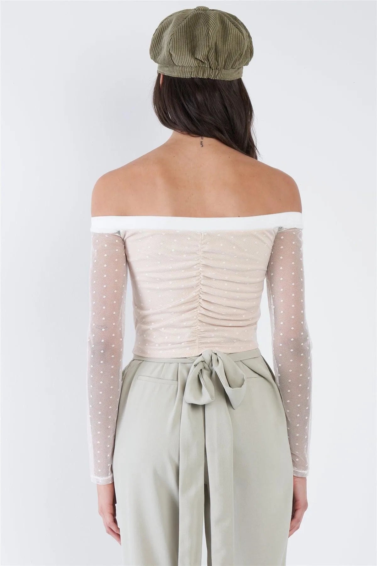Top Features: off-the-shoulder, crop, adjustable cinch center draw string, sheer, white polkadots, beige nude center, chic, casual, boho,"u" shape hem, unlined, stretchy. Model is 5'9 wearing a size Small ( Waist: 23.5", Bust: 32B, Hips: 36")Item Measurements: Length: 13" , Bust: 24" , Sleeve: 21.5" Item comes pre-packed with hang tagsTrue to size