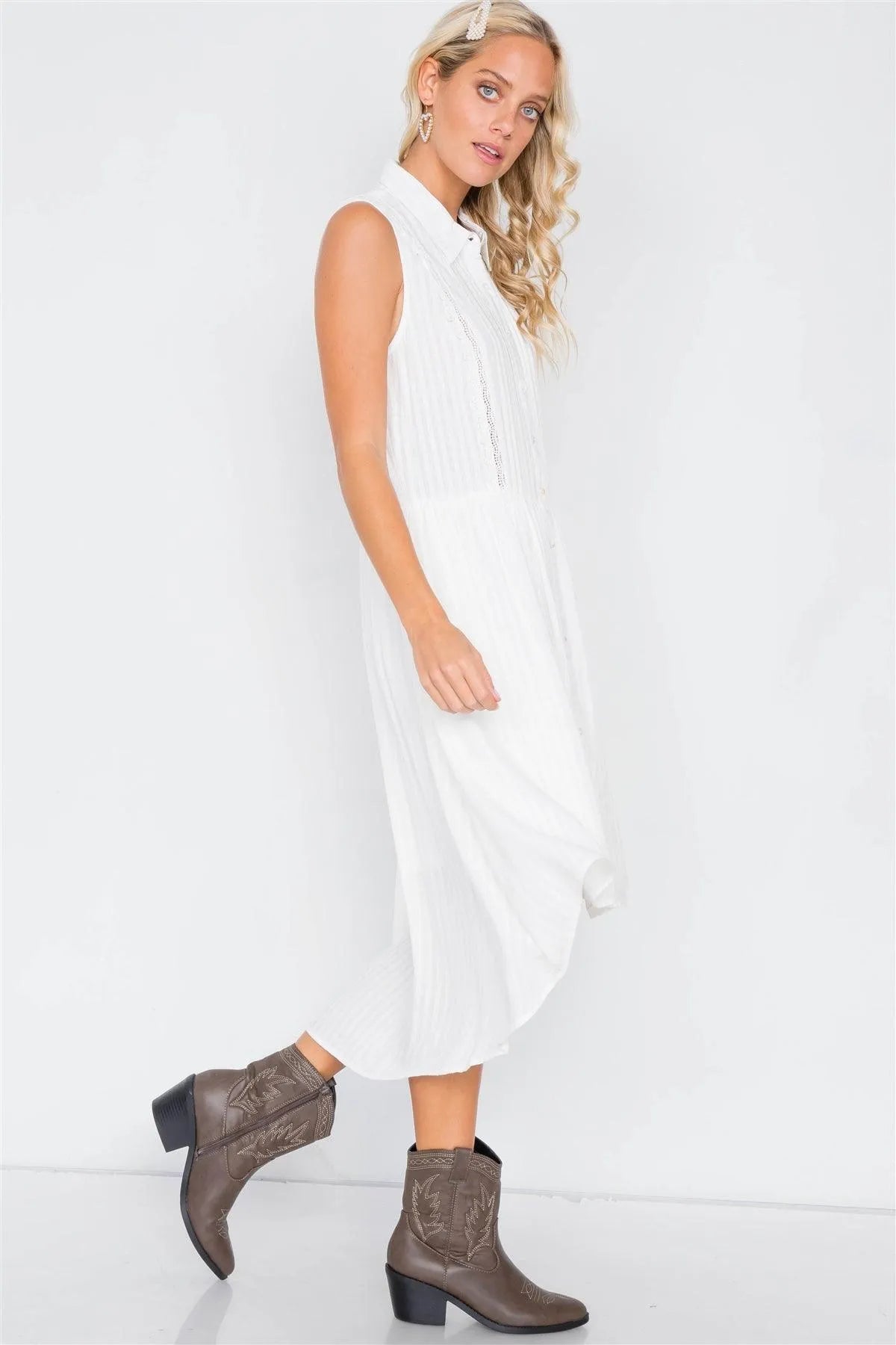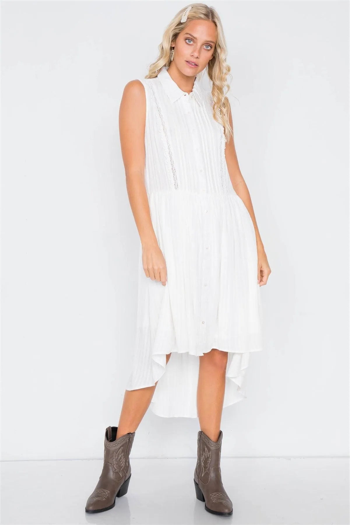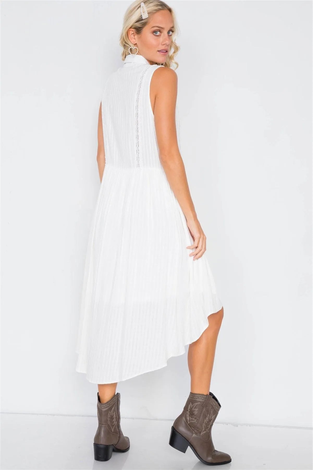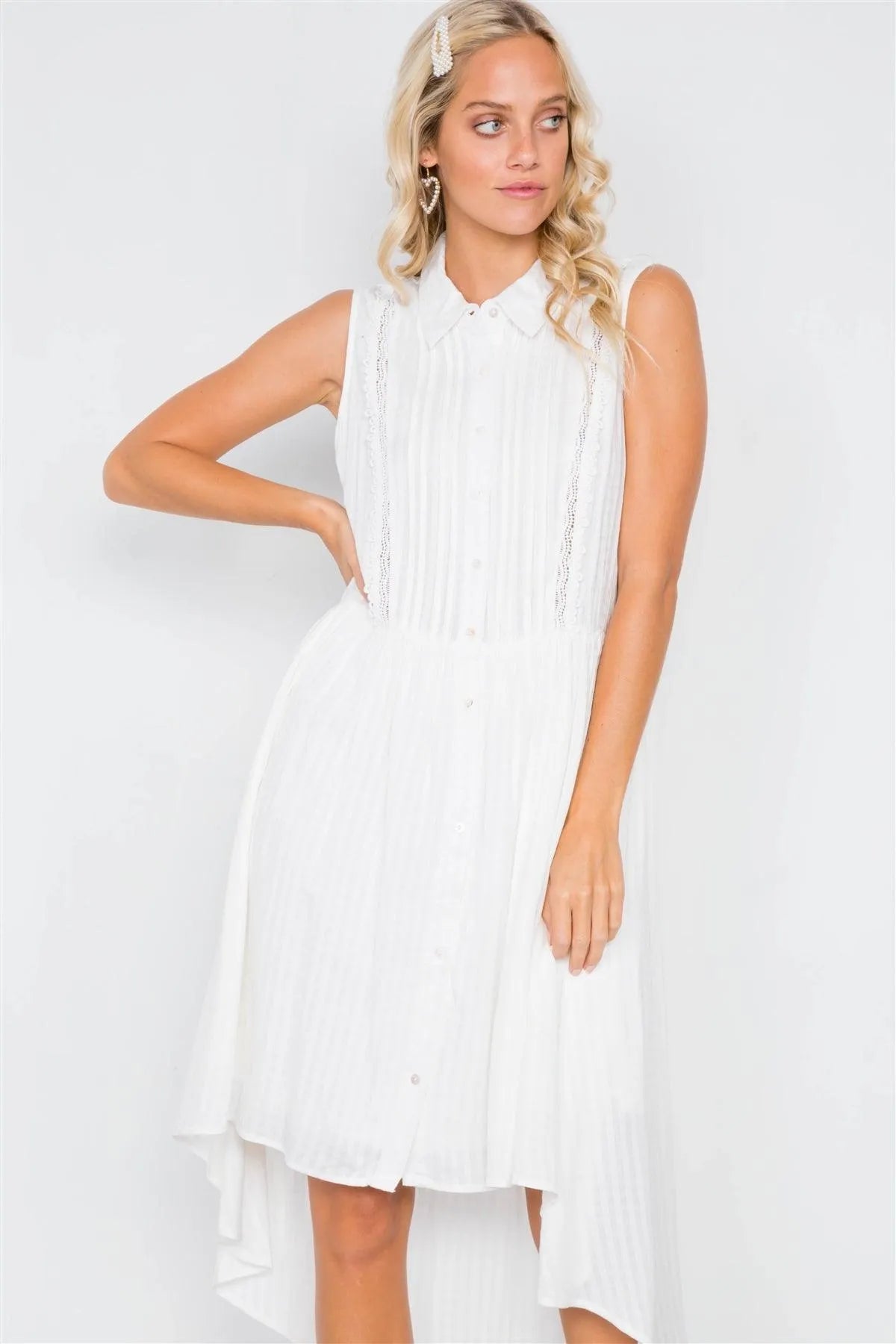 Dress features: high-low hem cut, sleeveless, collar, sheer bodice, elastic stretchy waist, full lined skirt, front button closure, lace trim pleat, pleated bodice, very stretchy, partially lined, vertical embroidered white boho print lines.Model is 5'8 and wearing a Small ( Bust: 32B", Waist: 25", Hips: 35.5")Top Measurements: Length: 48.5" , Bust: 34"True to size