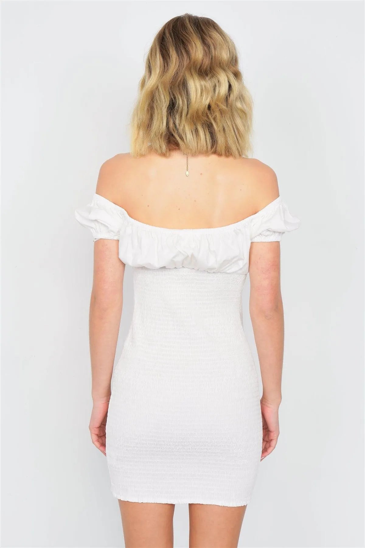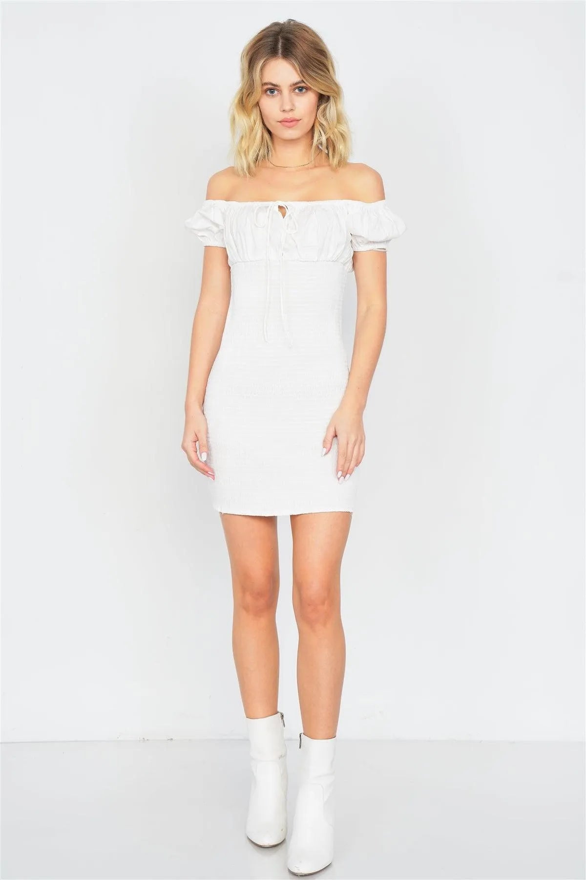 Dress features: boho, chic, solid, center keyhole self tie bow, semi-sheer, ruched bodice, mini length, chic, casual, puff cap sleeve, off the shoulder, unlined, very stretchy.Model is 5'5" and wearing a Small (Waist: 23", Bust: 32A", Hips: 24")Item Measurements: Length: 29.5" , Bust: 24" , Sleeve: 5"Item comes pre-packed with hang tagsTrue to size