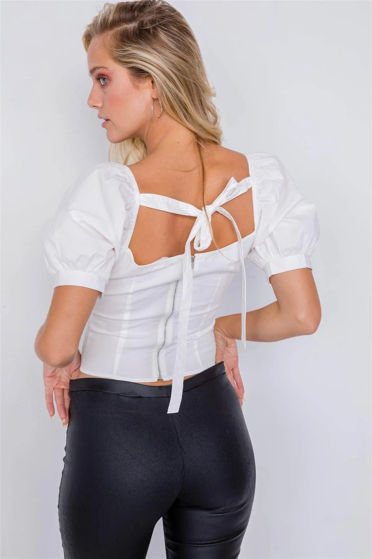 Off-White Sweetheart Neckline Puff Sleeve Open Bow Back Cotton Top /3-2-1