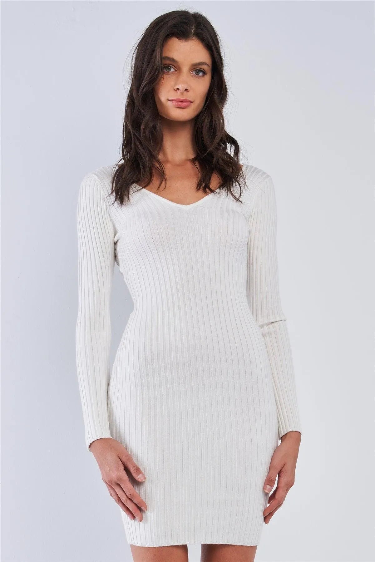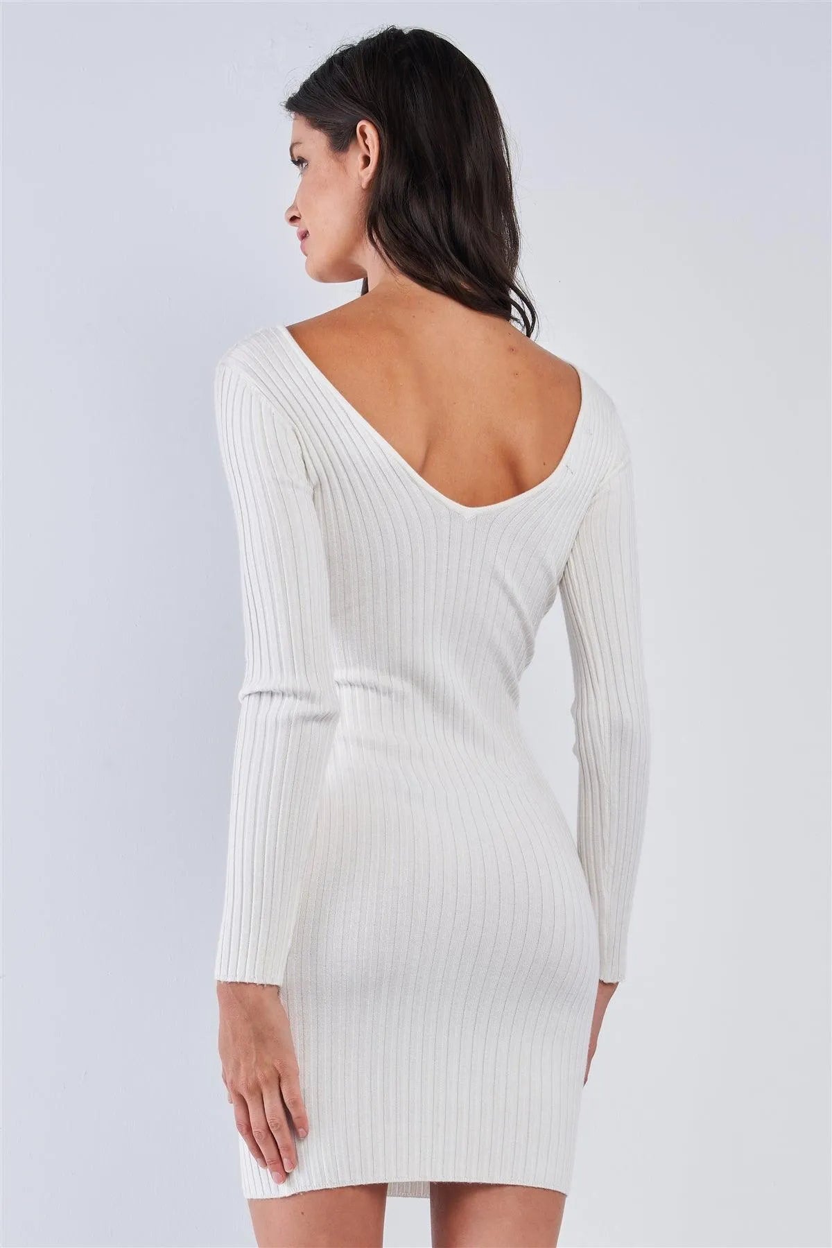 🖤 Item Features: Off-white, solid, ribbed knit, long sleeve, v-neck on both front and back, bodycon, fitted, mini length, unlined, stretchy, casual, comfy