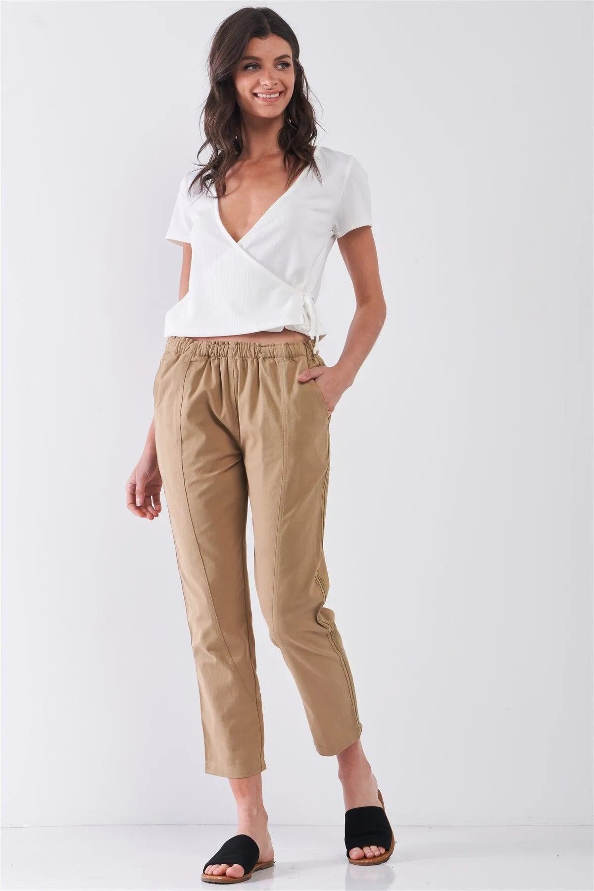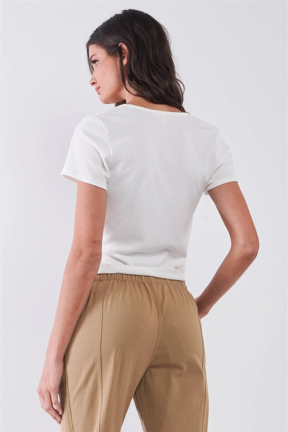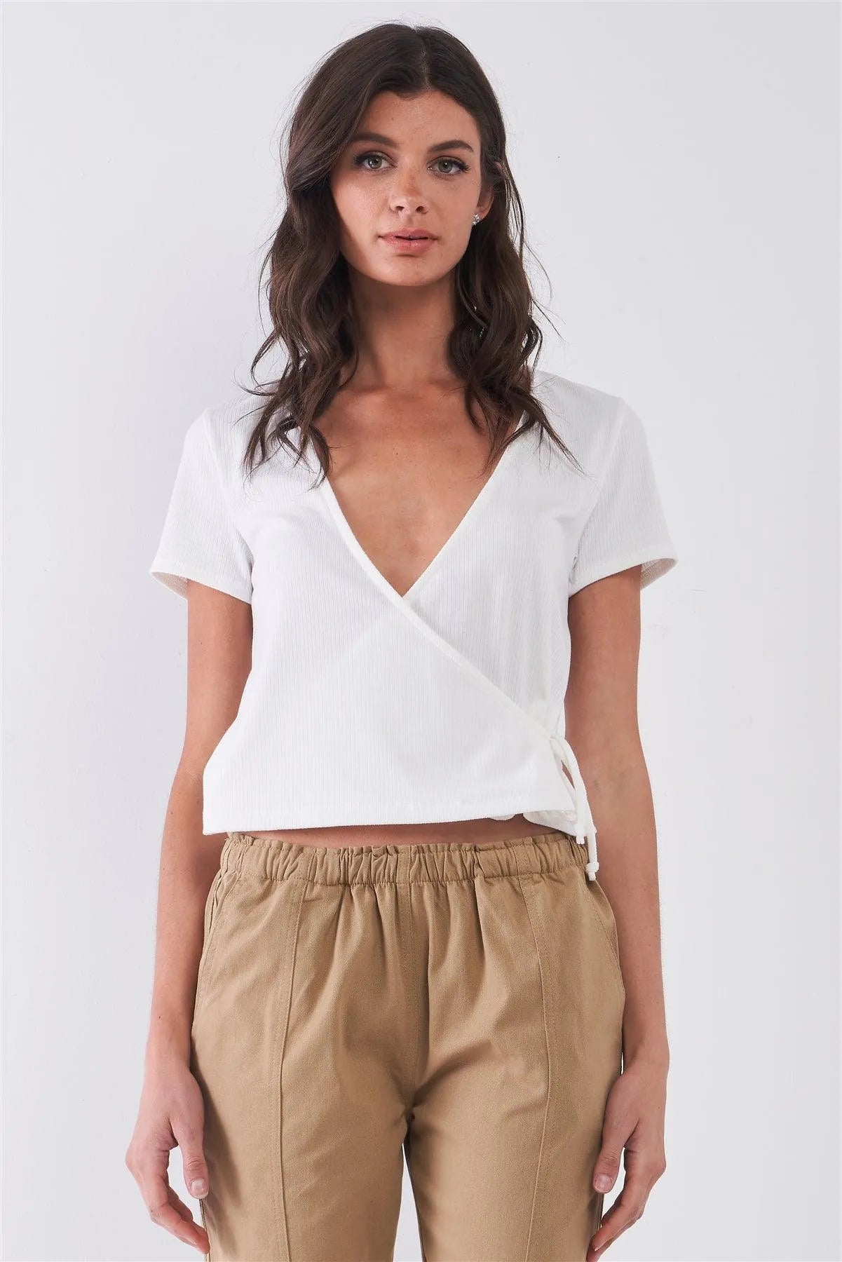 🖤Item features: Off-white, solid color, ribbed, short sleeve, plunging V-neck, self-tie side wrap front detail, fitted, unlined, stretchy, non-sheer, casual, basic, cute, breathable, comfy, spring/summer collection