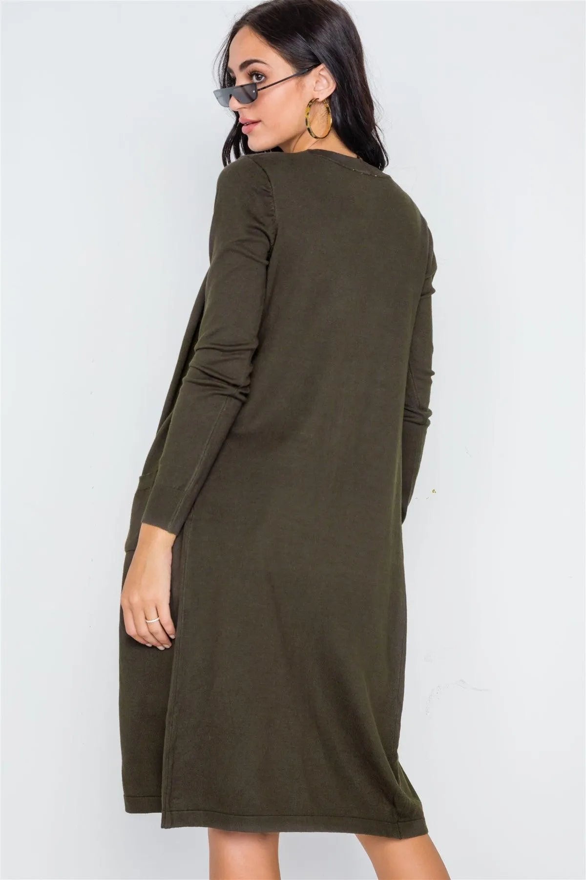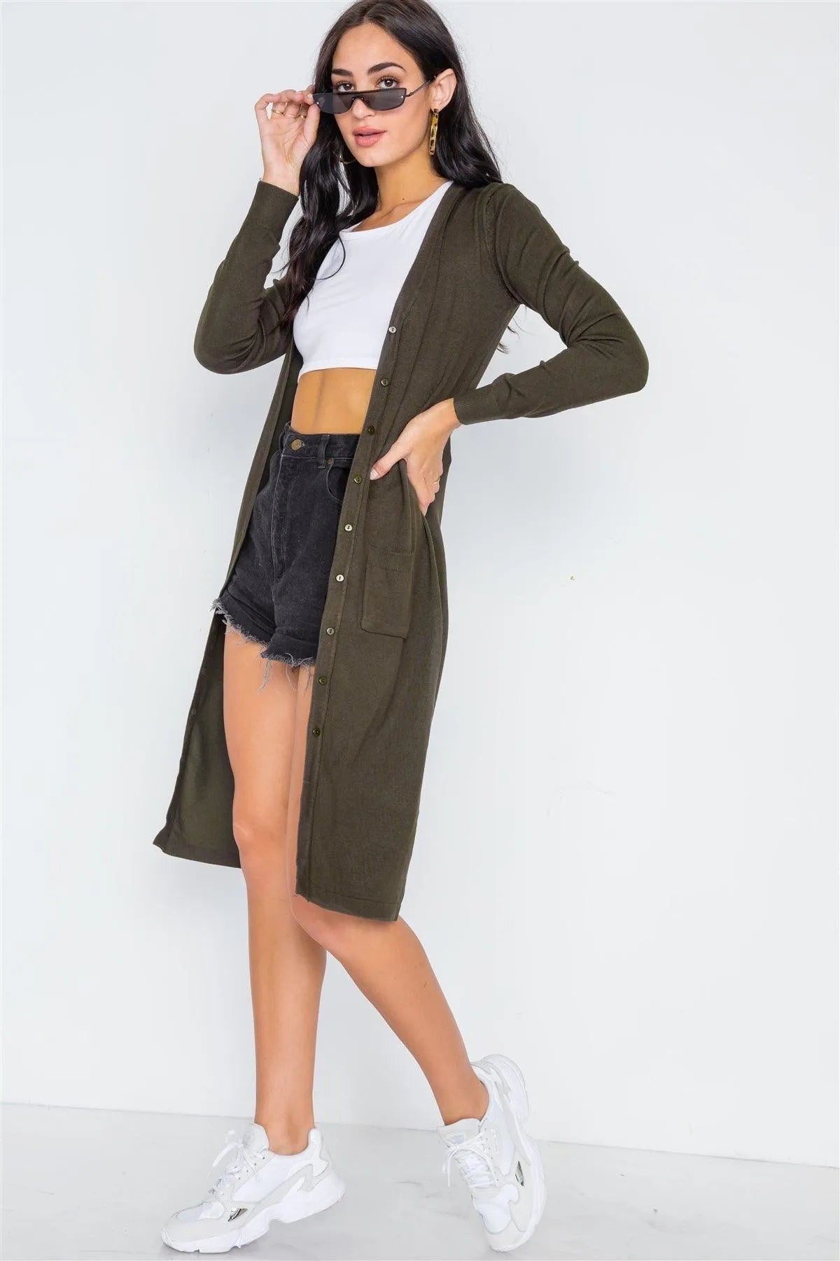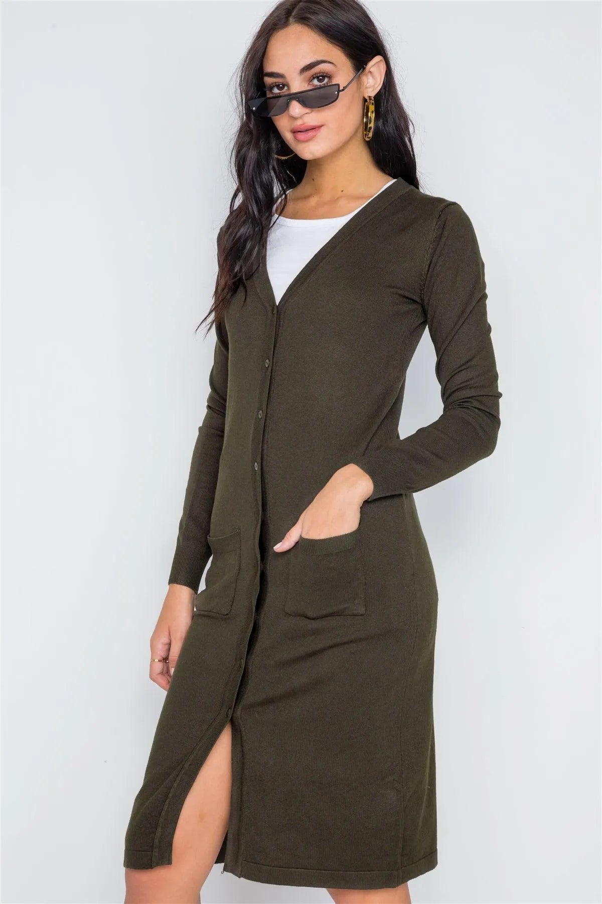Cardigan features: long sleeves, button front closure, front patch pockets, solidModel is 5'9 wearing a size Small ( Waist: 26", Bust: 34B, Hips: 36")Item Measurements size Small: Length: 43", Sleeves: 23"True to size