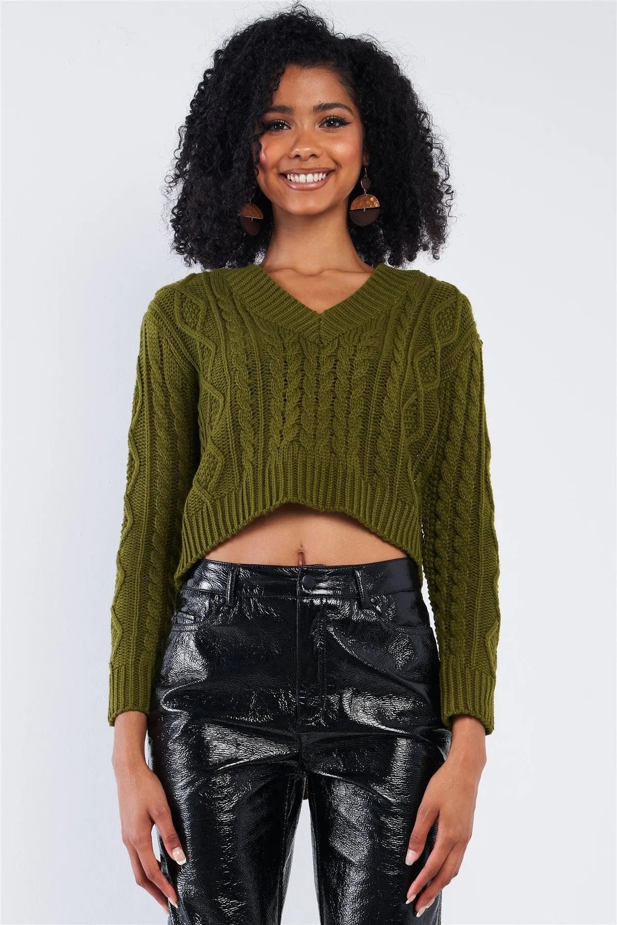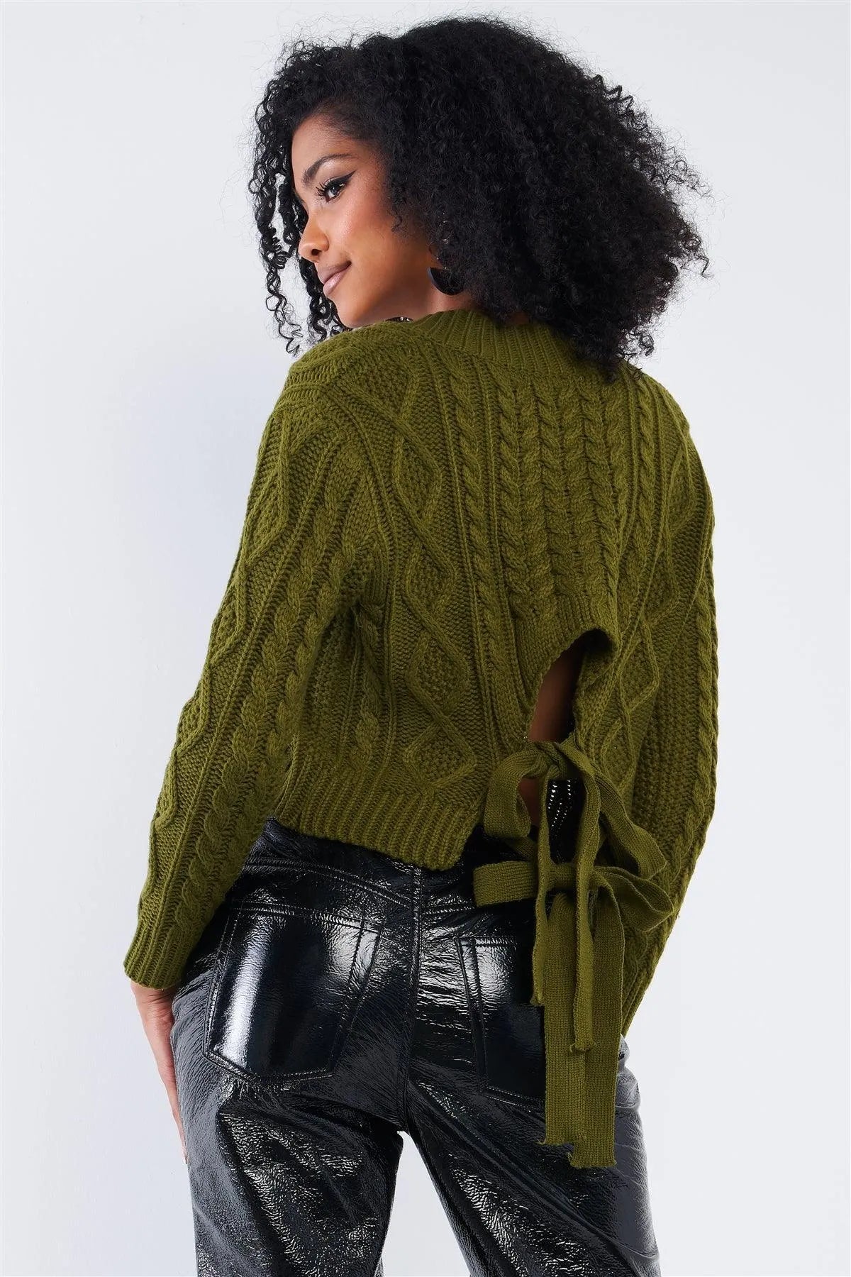 Olive Green Long Sleeve V-Neck Cable Knit Self-Tie Cut Out Back Cropped Sweater /2-2-2