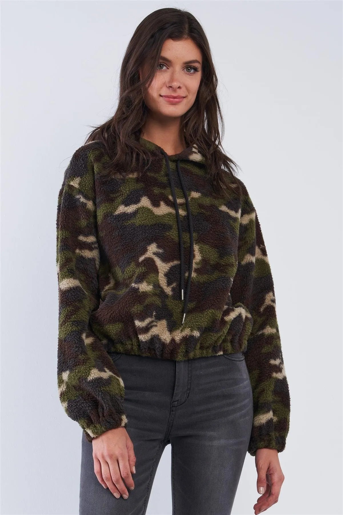 Olive Green Camo Print Plush Relaxed Fit Long Sleeve Draw String Tie Hoodie Sweater /3-2-1