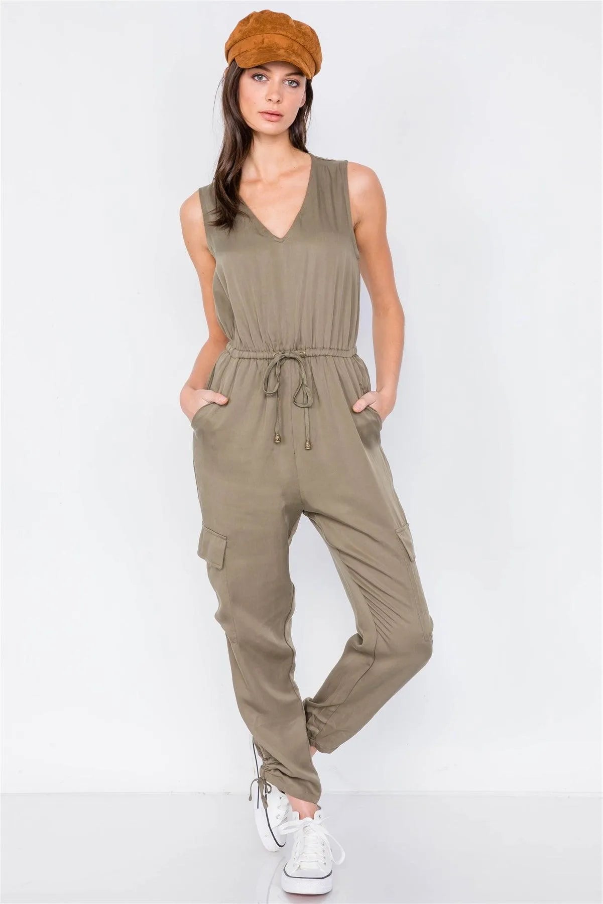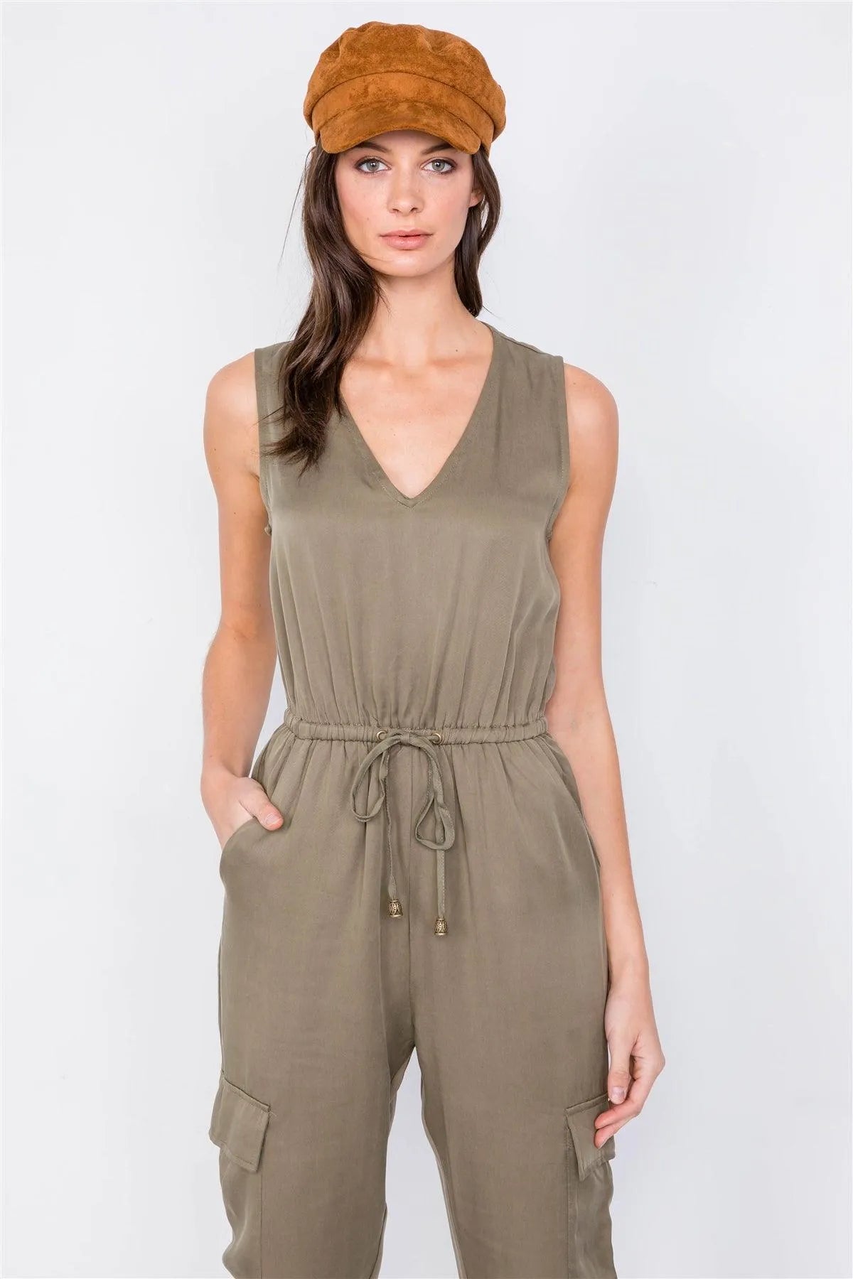 Olive Cargo Cinched Ankle Pant V-Neck Jumpsuit /3-3
