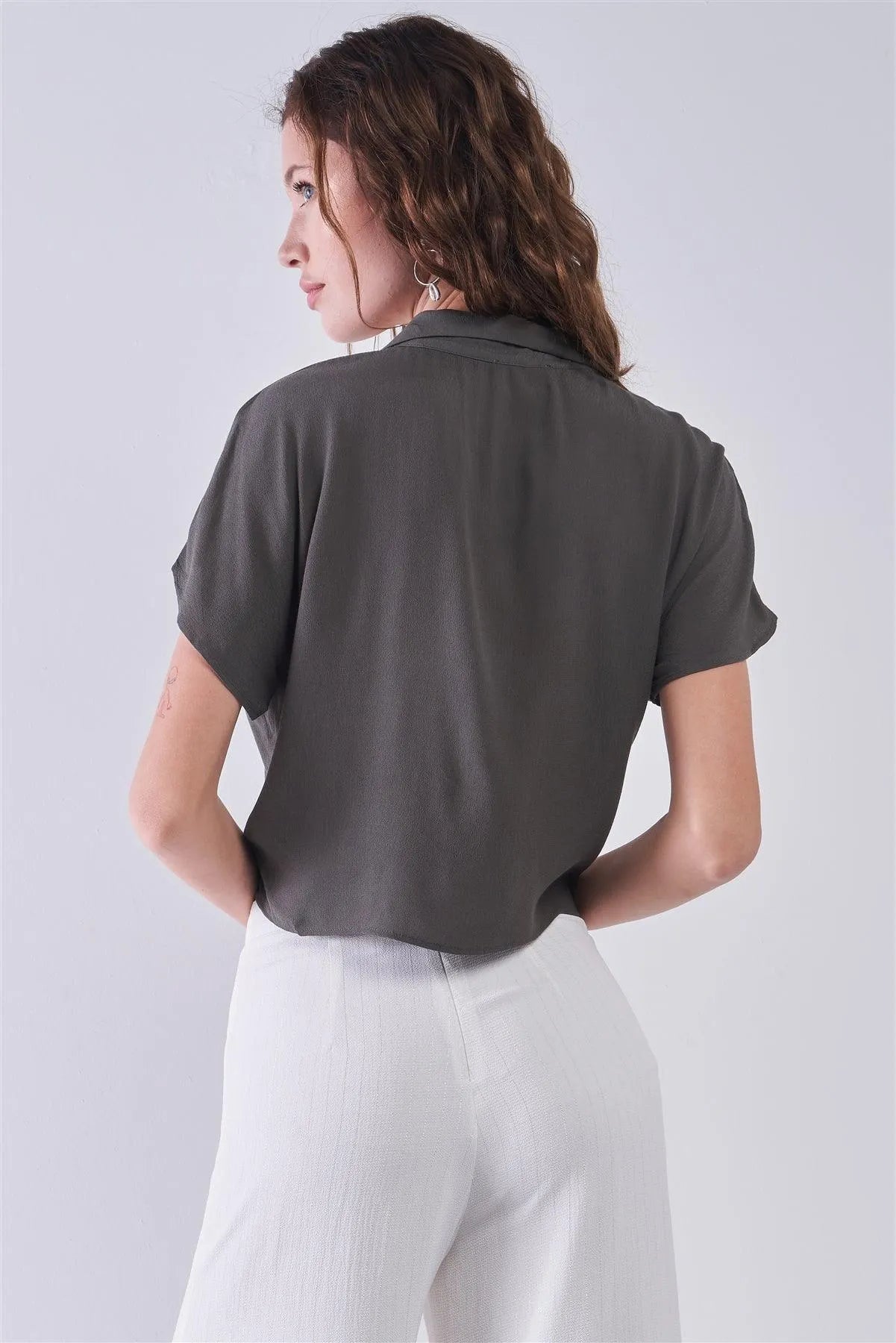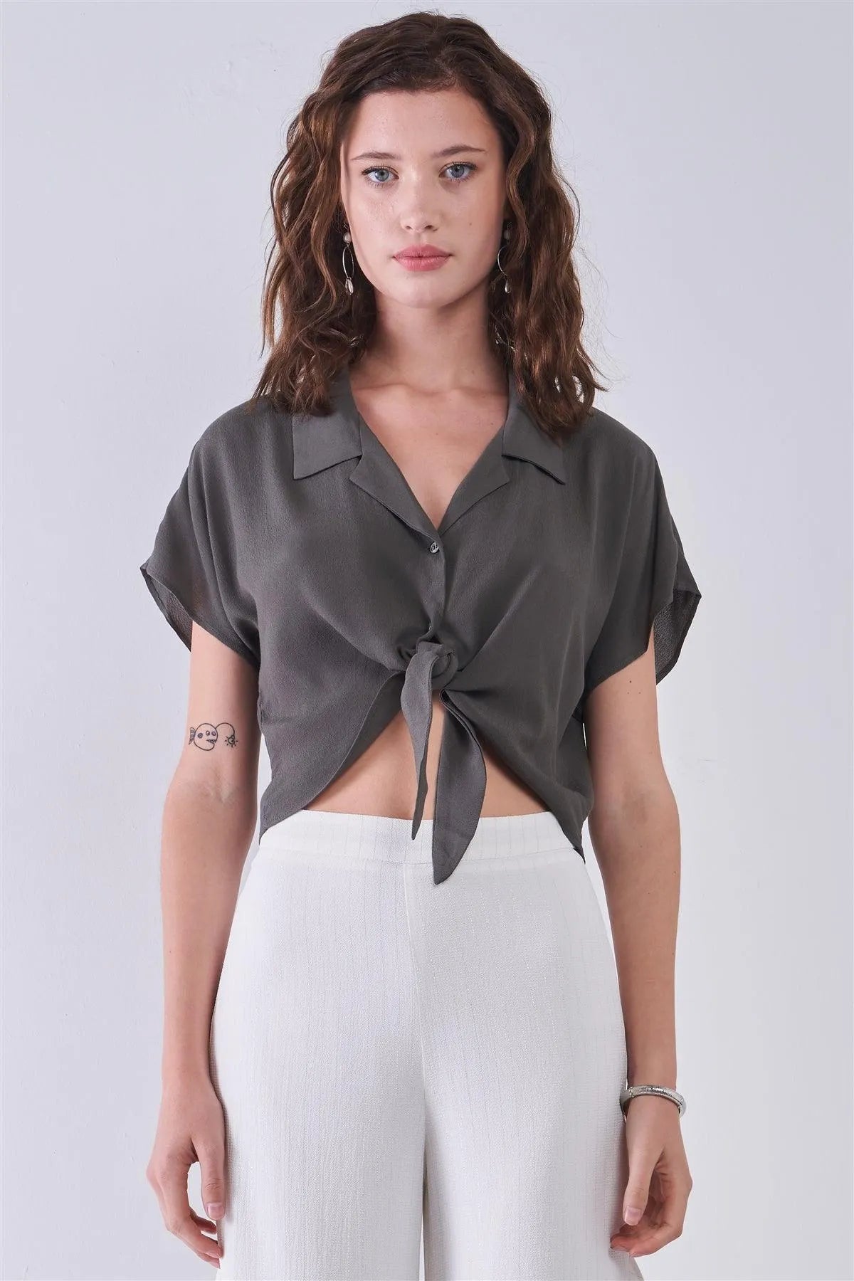 Olive Collared Short Sleeve Self-Tie Front Cropped Top /3-2-1