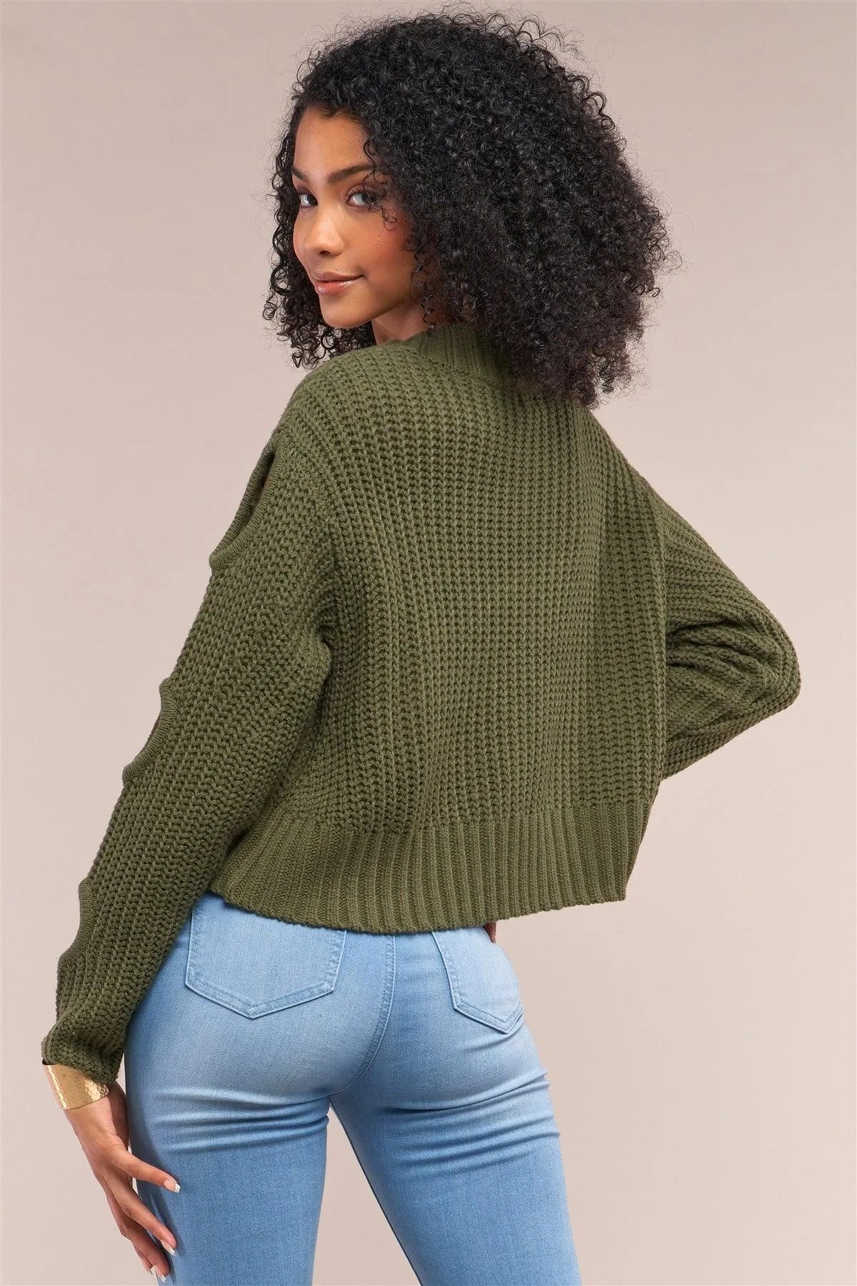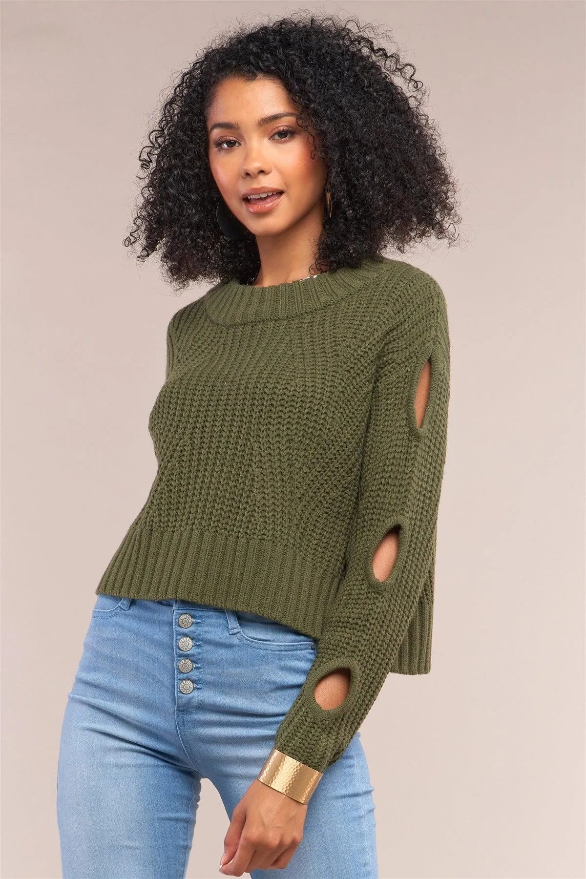 Olive Round Neck Long Cut-Out Detail Sleeve Cable Knit Cropped Sweater