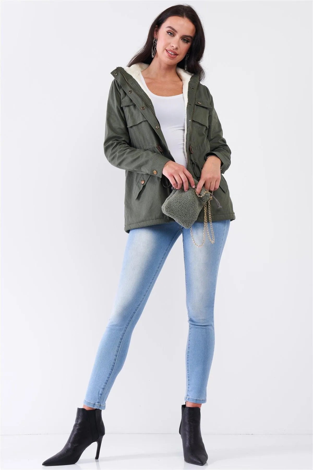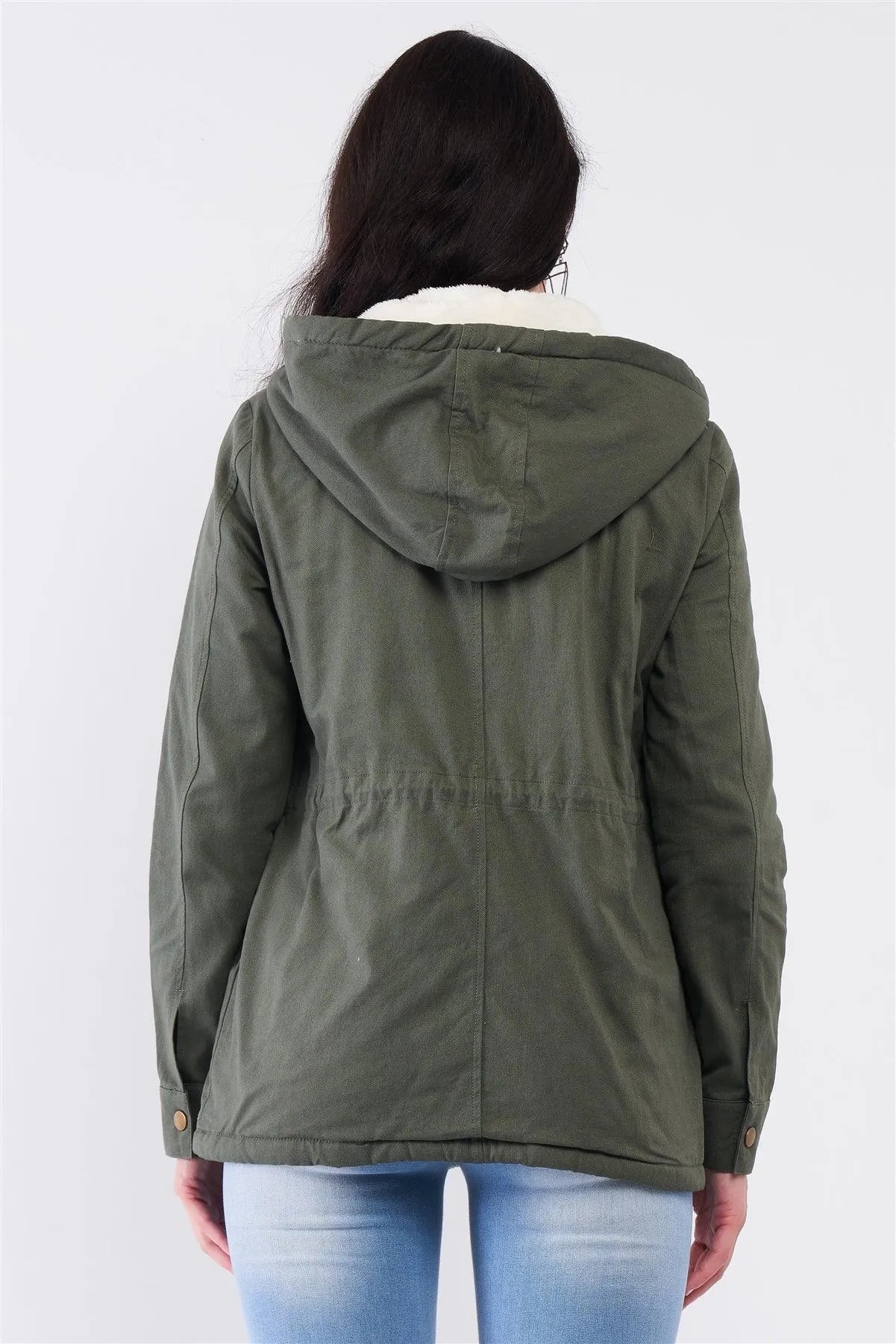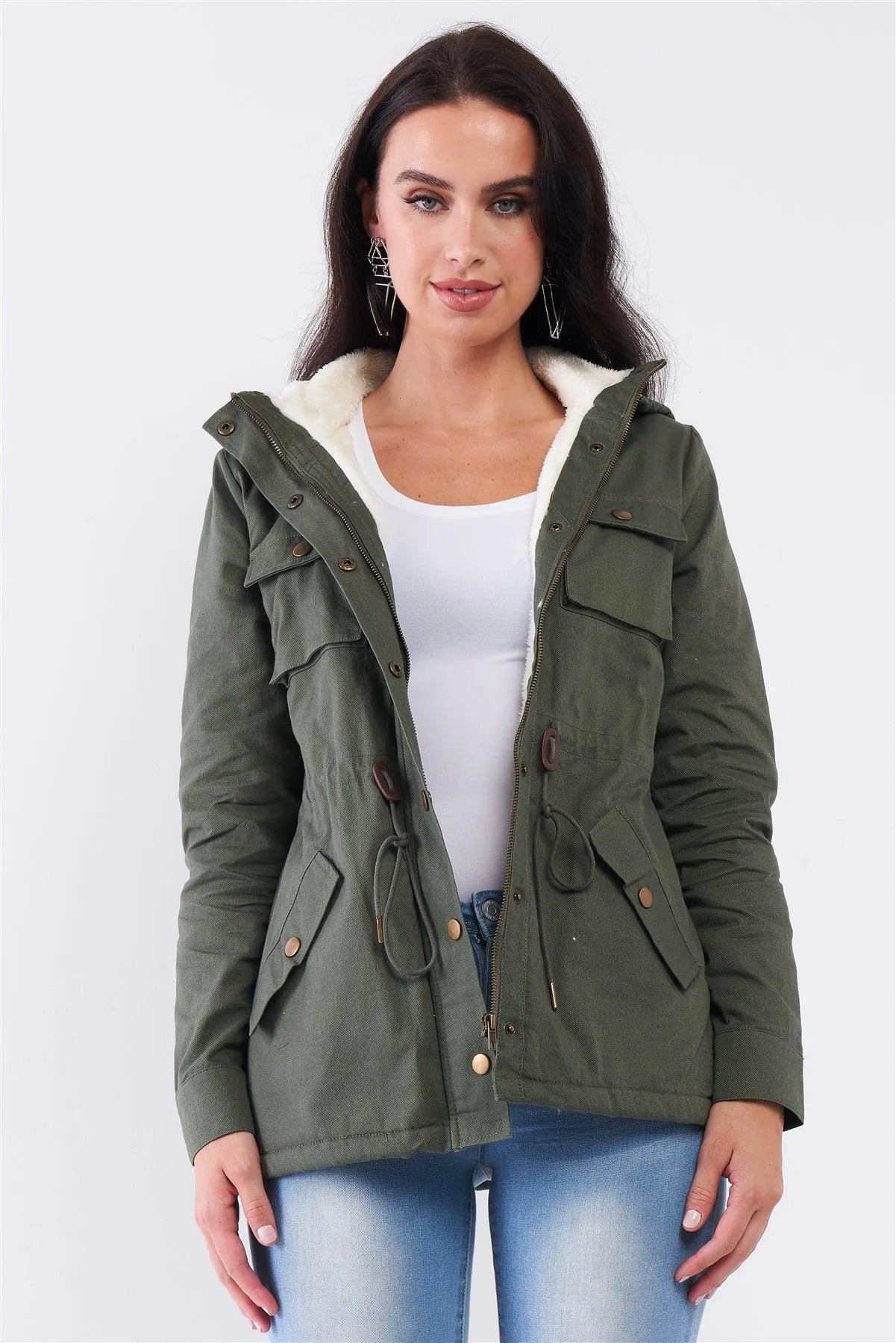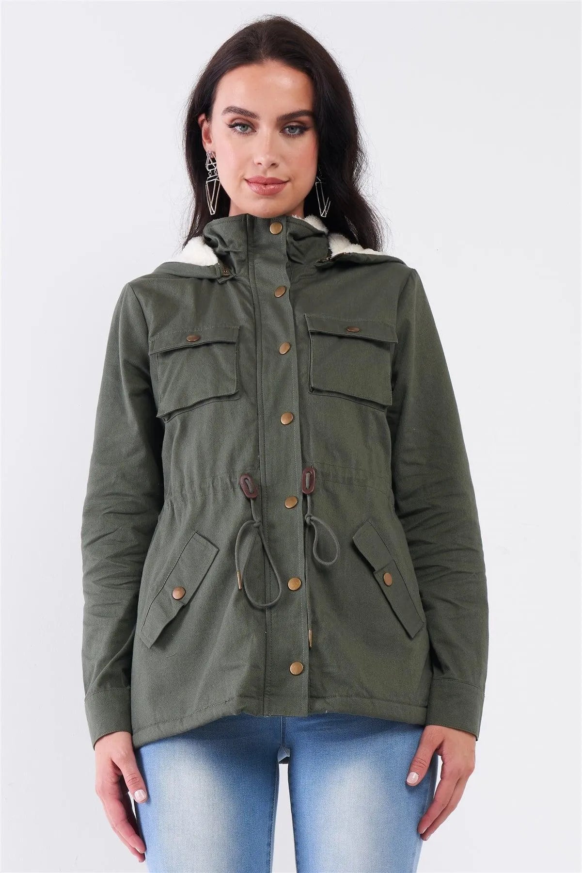 Olive Adjustable Fit Fleece Lining Detachable Hood Detail Zip-Up Utility Jacket /1-1-2-1