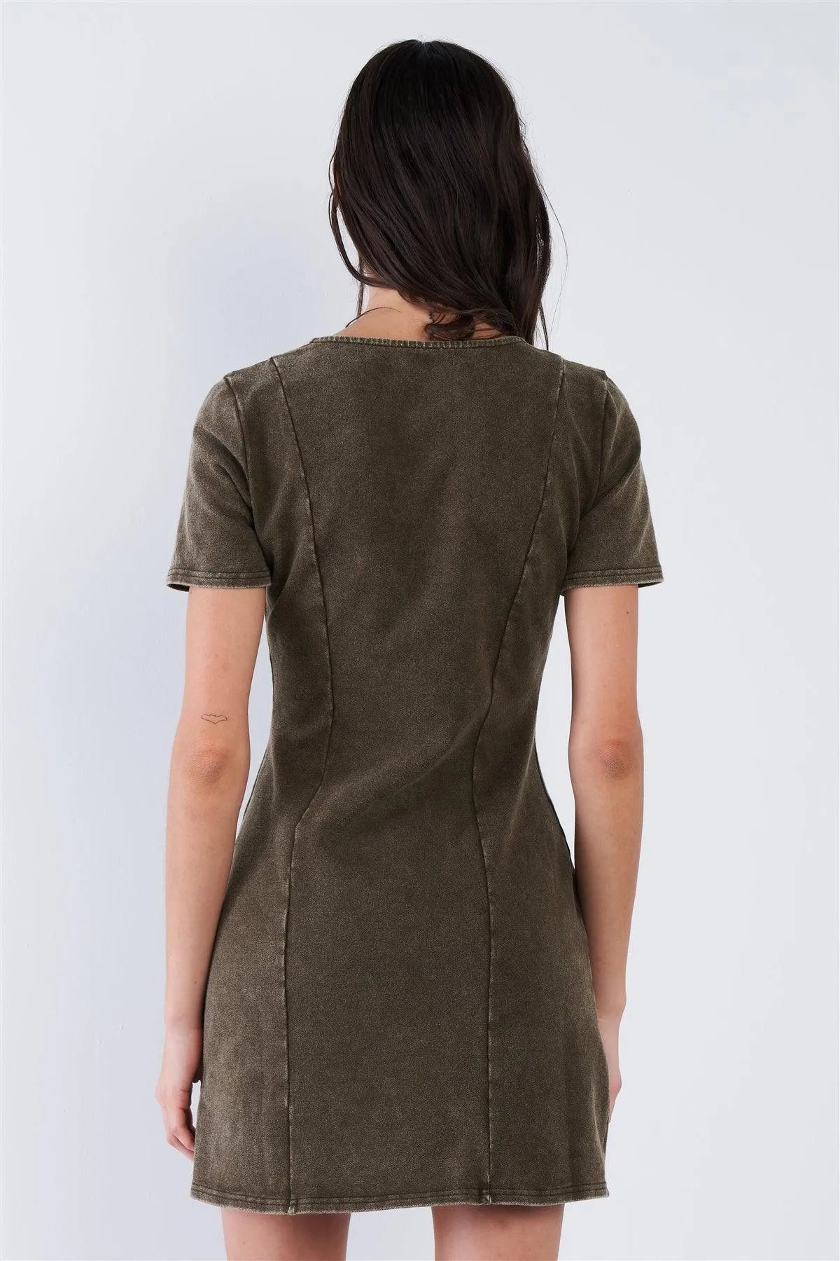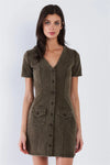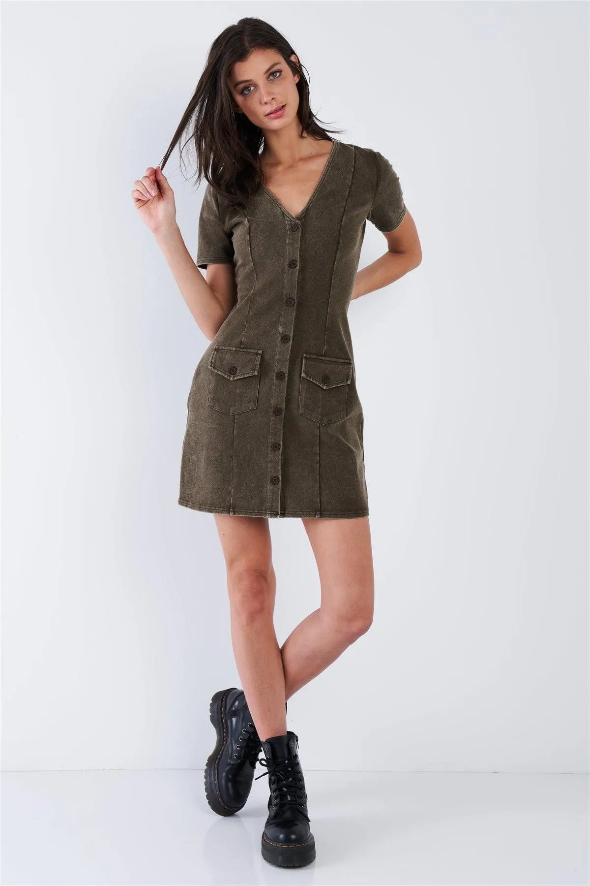 Olive Green Acid Washed V-Neck Button Down Mini Dress /3-2-1
