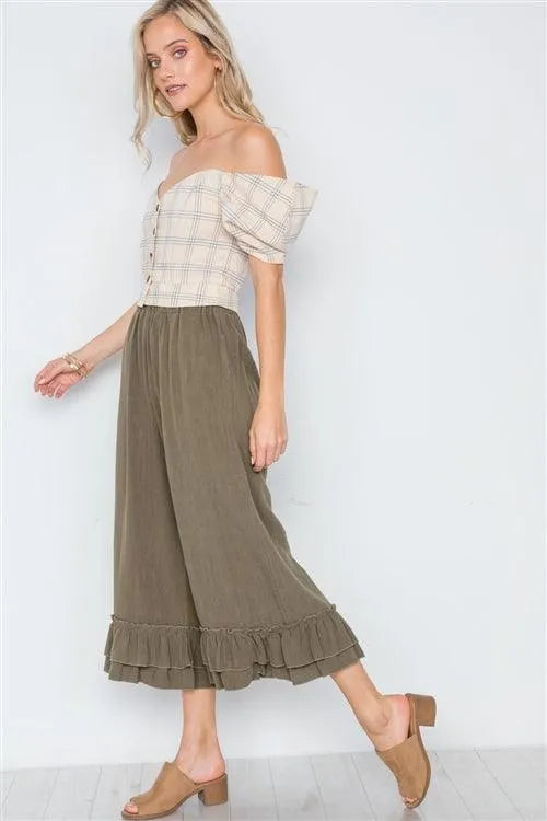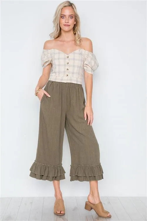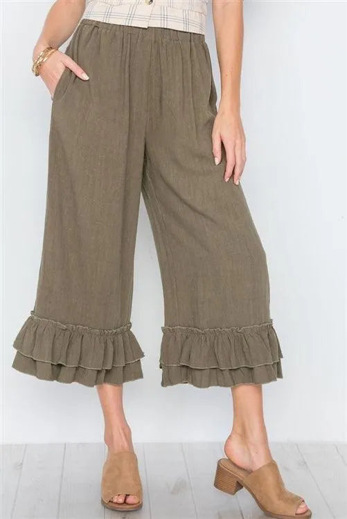 Olive High-Waist Ruffle Hem Wide Leg Boho Pants /3-1-1
