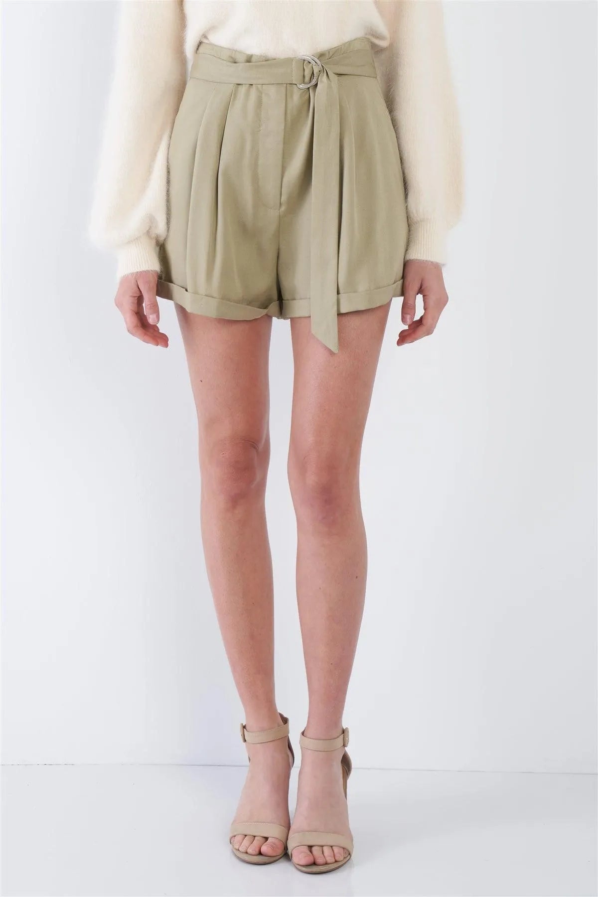 Olive High Waist Tie Sash Pleated Cuffed Hem Mini Shorts /4-2-1