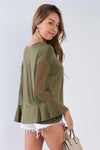 Top Features: Solid olive, green, long mesh sleeve, bell hem sleeve, unlined, soft, stretchy, casual Model is 5'10" and wearing a Small (Waist 26", Bust 33B", Hips 35")Item Measurements: Length: 24" Bust 45"Item comes pre-packed with hang tags True to size