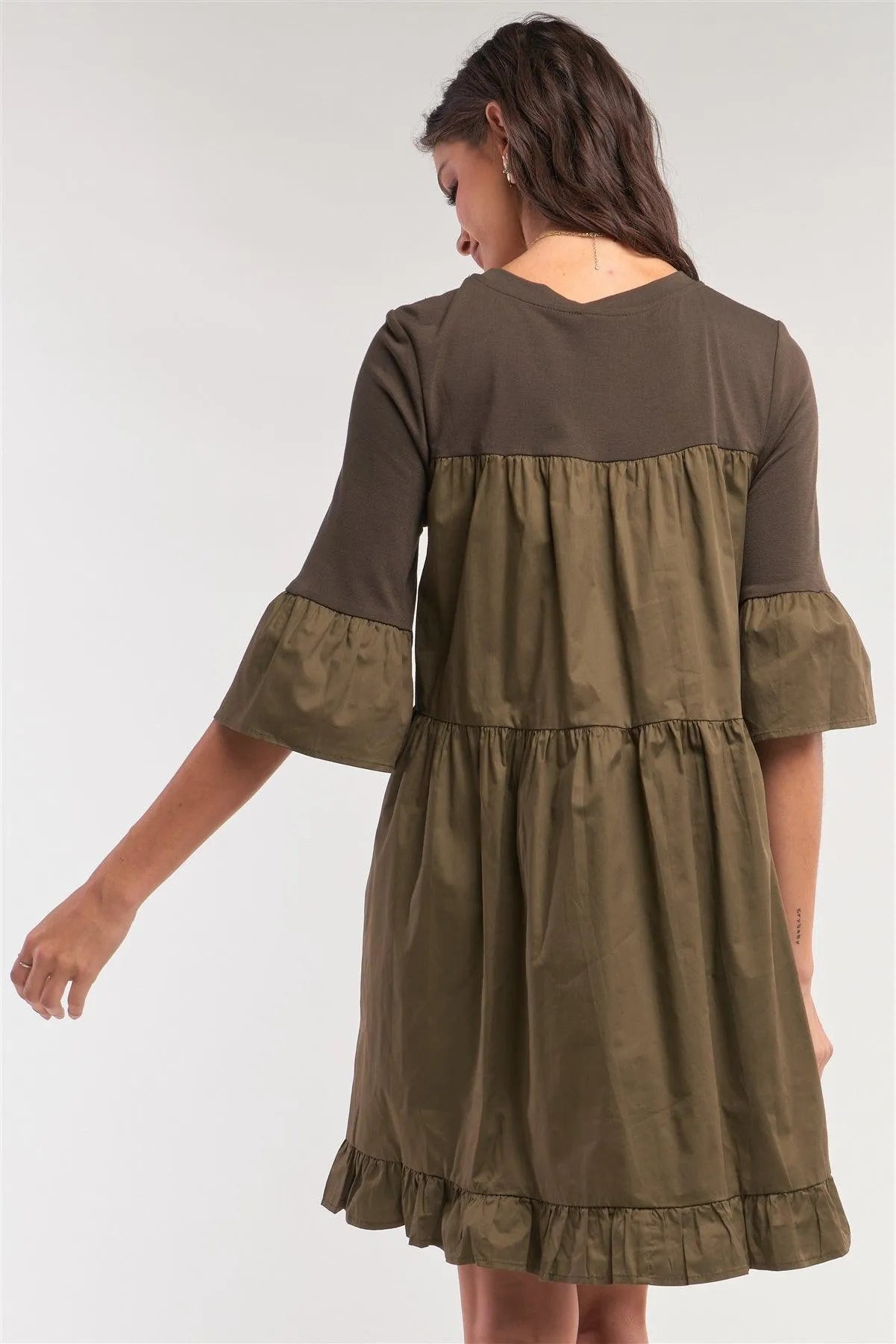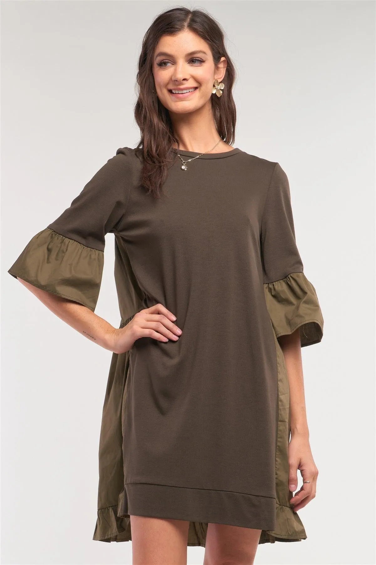 Olive Loose Fit Crew Neck Ruffle Detail Midi Sleeve Cotton Back Panel Detail T-Shirt Mini Dress /1-2-2