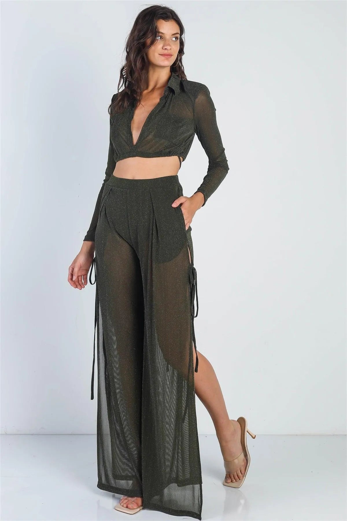 🖤 Item Features: Olive, lurex, shoulder pads, long sleeves, collared, two front pockets, v-neckline, adjustable drawstring wrap around hem, cropped top, high waist pants, elasticized waistband, back zipper closure, side slits with self-tie details, wide leg, sheer, unlined, semi-stretchy, hot, sexy, eye-catching, shiny, night-out attire