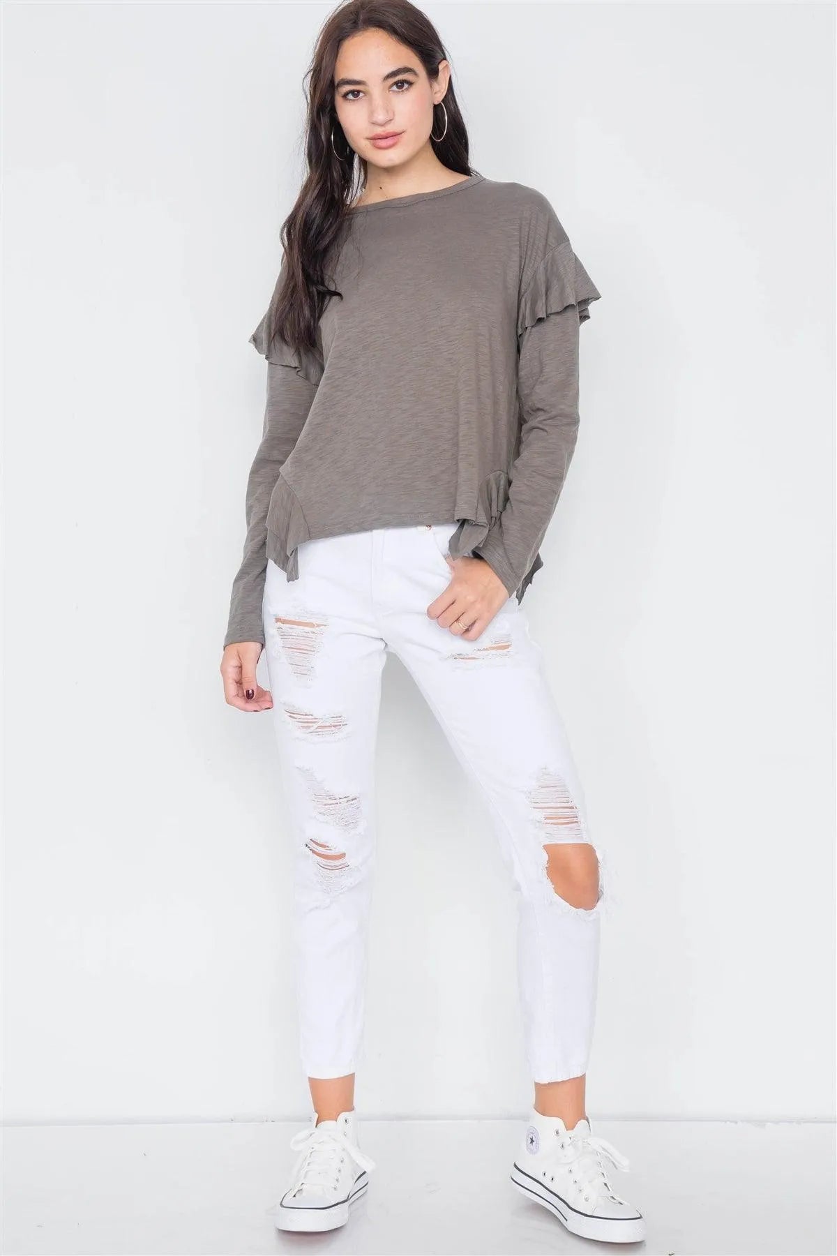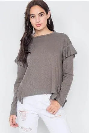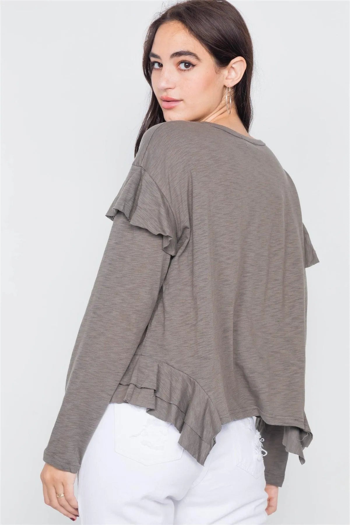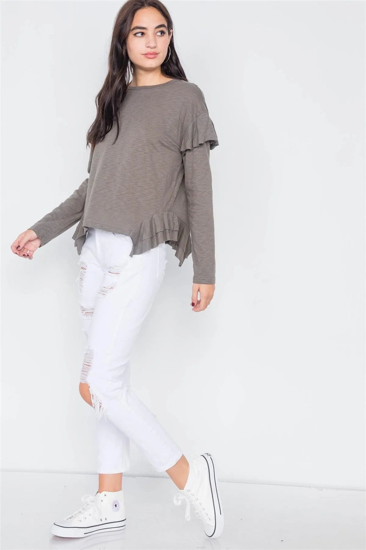Olive Raw Handkerchief Hem Flounce Long Sleeve Cotton Top /3-2-1