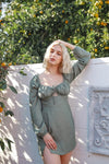 🖤 Item Features: Olive, solid color, shiny, puff balloon long sleeves, front bust cut-out detail, front self-tie, front slit, mini length, back hidden zip closure, lined, non-stretchy, elegant, girlish, cute, stylish, eye-catching look, trendy