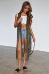 🖤 Vest Features: Brown, solid, olive interior, cropped, long fringe detail, unlined, no stretch, seamless, summer, boho, festival