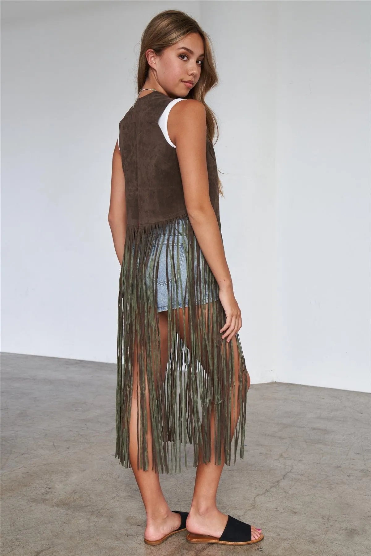 Brown & Olive Sleeveless Suede Cropped Boho Vest With Long Fringe Detail /2-2-2