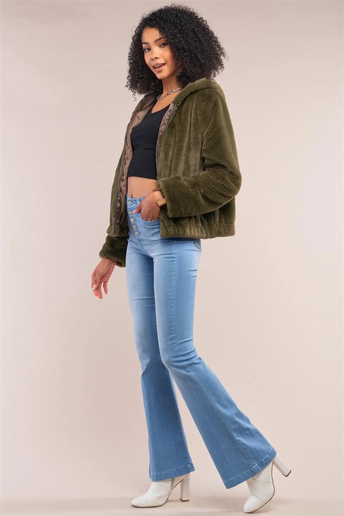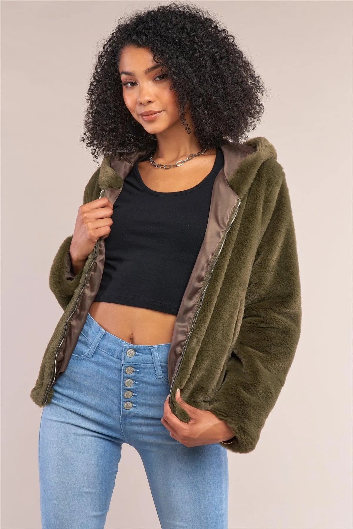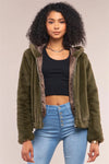 Olive Soft Faux Fur Hooded Zip-Up Jacket /2-2-2